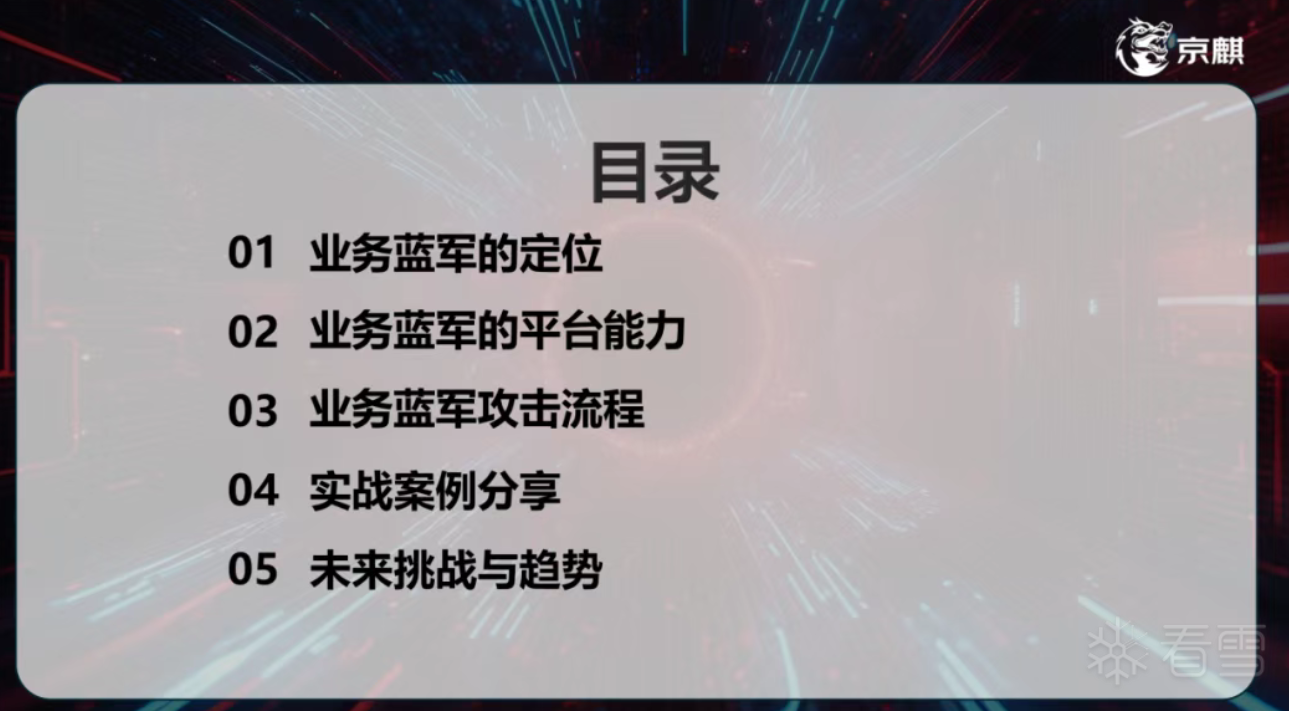 今天我要讲的内容分为五个部分。首先,是业务蓝军的一个定位。其次,是业务蓝军的平台化的能力,以及业务蓝军的攻击流程,还有业务蓝军的实战案例的分享,以及未来可能存在的一些挑战与趋势。