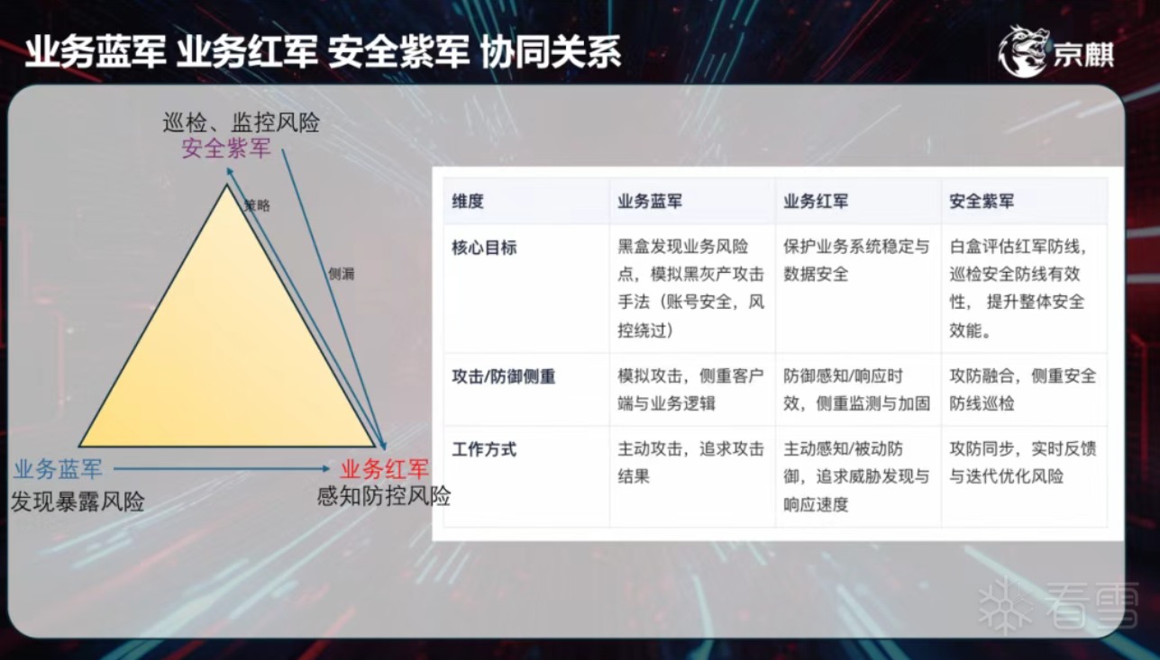 核心落点就是我们通过第三步的真实模拟攻击,帮助业务做一些防控上的策略提升和策略优化,提升对应的业务安全水位。在这过程中,其实就会衍生出三个团队,就是我们内部刚才包括袁老师也说到的红蓝紫的一个概念。