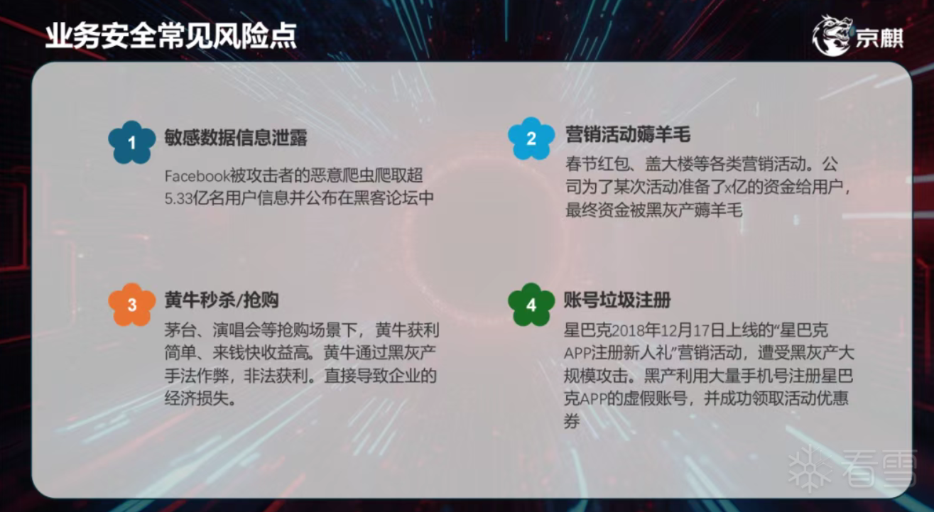 3. 第三个风险点其实就是像黄牛类的秒杀、抢购。比如说像茅台,还有一些手机以及像演唱会等抢购场景。对于黄牛来说,它们的获利简单,因为只要抢到,他们就能赚到。其次呢,他们还能做到来钱快、收益高。黄牛通过这类黑灰产场景的手法去作弊,对于平台来说,或者对于消费者来说,都是有资金损失的。本身我们是希望通过低价或者相对便宜的方式,直接让消费者来获利。但是,黑灰产、羊毛党以及黄牛党来和我们竞争和对抗以后,会导致我们实际的投入变成了被别人薅走。