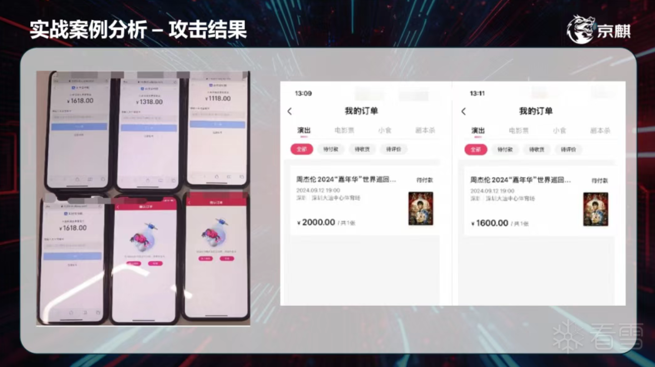首先我们调研了演唱会票务的售卖途径,比如说有APP、web,甚至有一些小程序、H5等。我们会去测试它整体的薄弱点。在这个过程中,我们会把整体的演唱会路径全面拉齐,把APP、小程序、H5全部都做一次演练。在演练结束后,我们会发现哪些场景下会有严格的设备指纹对抗。比如说,我们投入了很大的资源,最后去抢票后都是失效的,都是失败的,我们就会发现这个防控水位其实相对来说还好,或者我们还可以做深层次的逆向去逆过程中的一些防控算法逻辑。