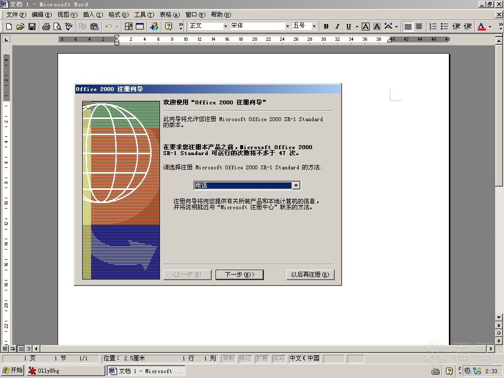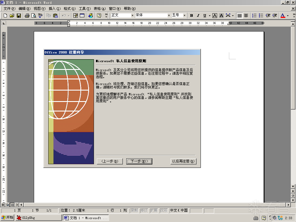 最近读到一位网友的文章提到任何正版Office 2000,只要在2003/4/15 0:00:15 utc之前运行,都会弹出注册向导,于是把虚拟机的日期改到2001年,再次安装原版 Office 2000,