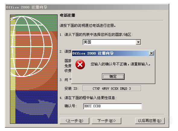 可以看到安装 ID,输入一个假的确认号单击下一步,出现错误提示,