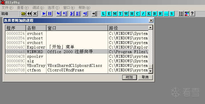 不要关闭错误对话框,打开Ollydbg,选择“文件”-“附加”,