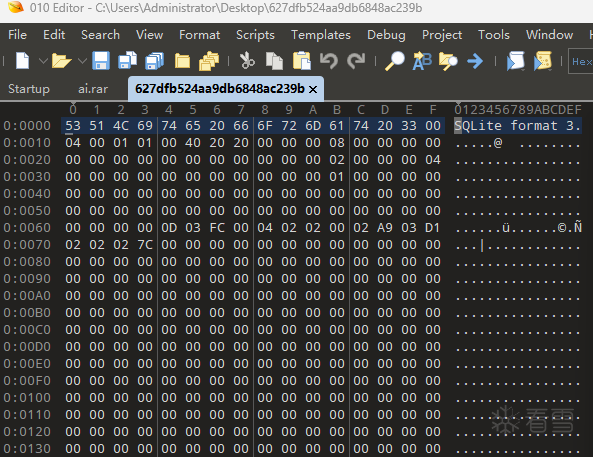 比如我们常常在软件中看到大量没有扩展名的文件,我们不知道他们的文件格式,但是可以通过 010 Editor 打开文件,我们通过Magic Head,就能了解到他们的文件格式,常见的有SQLite文件,用 010 Editor 打开后,能清晰的看到文件头为SQLite format 3。如下图,