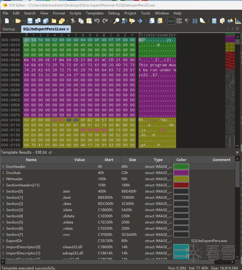 我们通过文件头了解文件的类型,还可以通过二进制来分析文件的结构。每一种固定的文件格式都有固定的二进制结构。比如说常见的可执行文件,如EXE文件,我们用010 Editor 打开,能够明显看到他的结构形式,这对于我们分析了了解EXE文件如何加载运行的,有很大帮助。