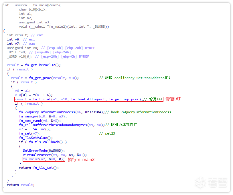 在main1函数的开头,恶意代码首先修复重定位表,之后通过修复IAT表的方式进行内存加载PE,并通过回调执行fn_main2函数。
