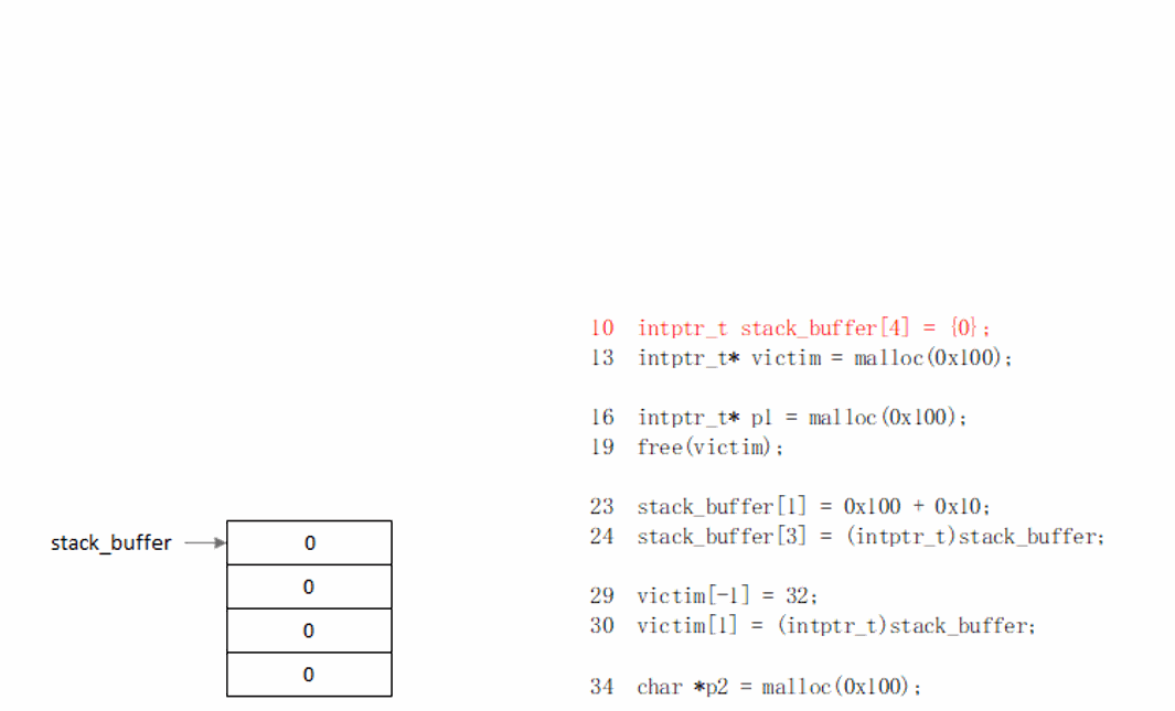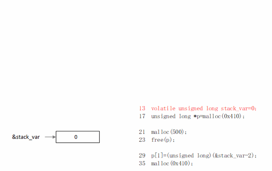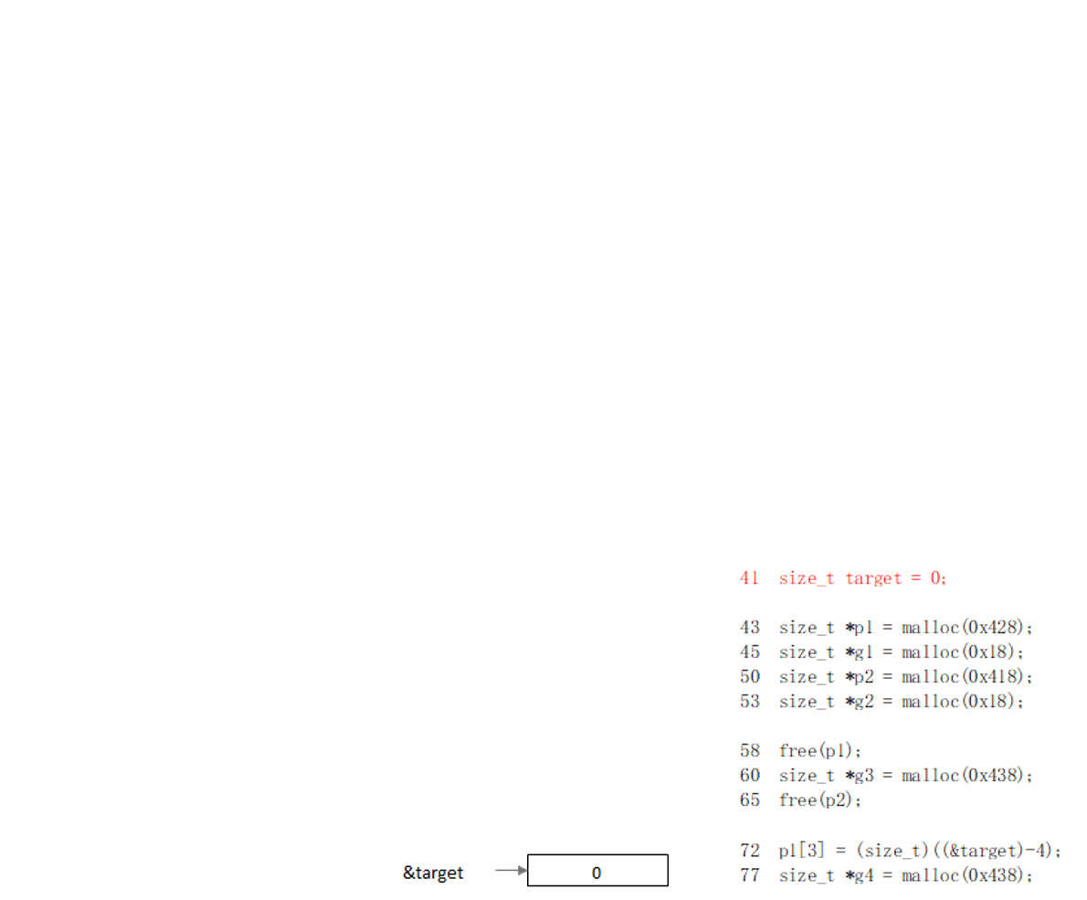 相比unsorted_bin_attack.c,在执行34行之前,将chunk(victim)->size改掉了,使其不满足malloc(0x100)的要求,使其移入smallbin[0],从而继续往后遍历,最终分配到fake_chunk。