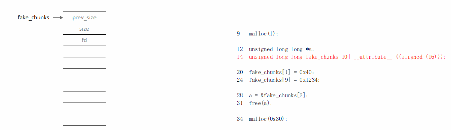 释放fake_chunk前,先要设置地址相邻的next_chunk->size,保证它属于(2*SIZE_SZ, av->system_mem)区间,绕过free()内部的检查。