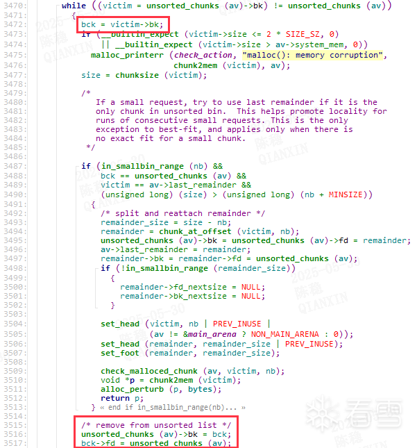 (2) 停止遍历unsorted_bin,从而fake_chunk仍然链在unsorted_bin,并且fake_chunk->fd,指向了unsorted_bin,unsorted_bin->fd,仍然指向chunk(p)。