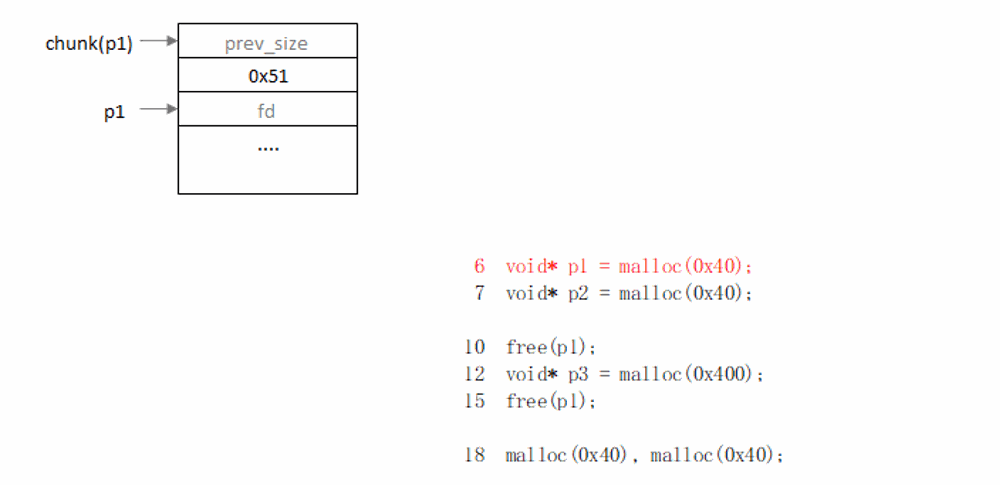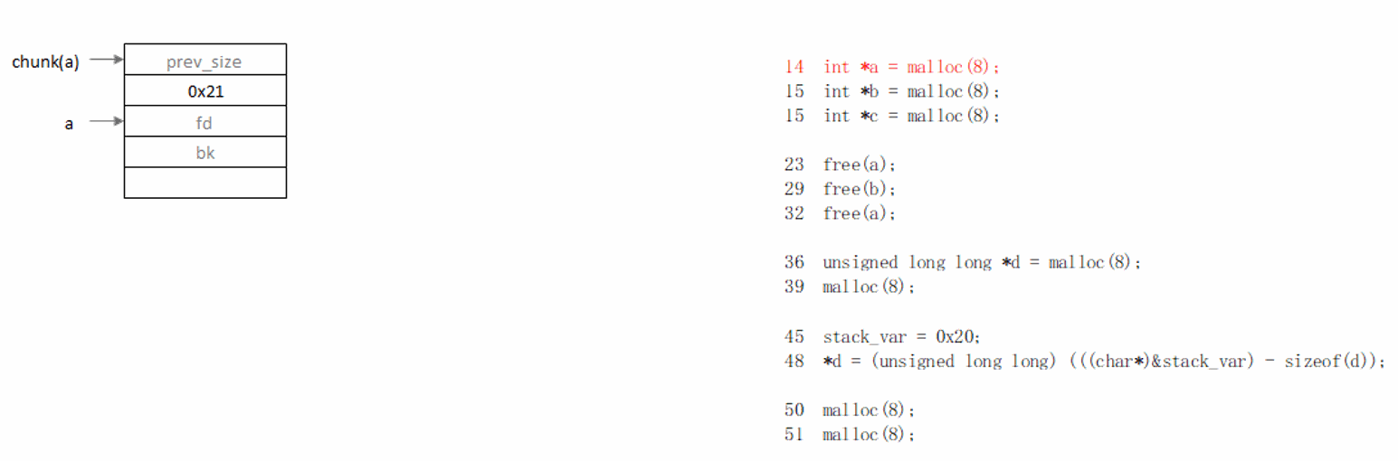 向fastbin添加chunk之前,只会检查链表头是否为要添加的chunk,不会检查整个链表(否则会影响free()的效率),所以在两次free(a)之间,执行一次free(b),就可以绕过glibc检测。