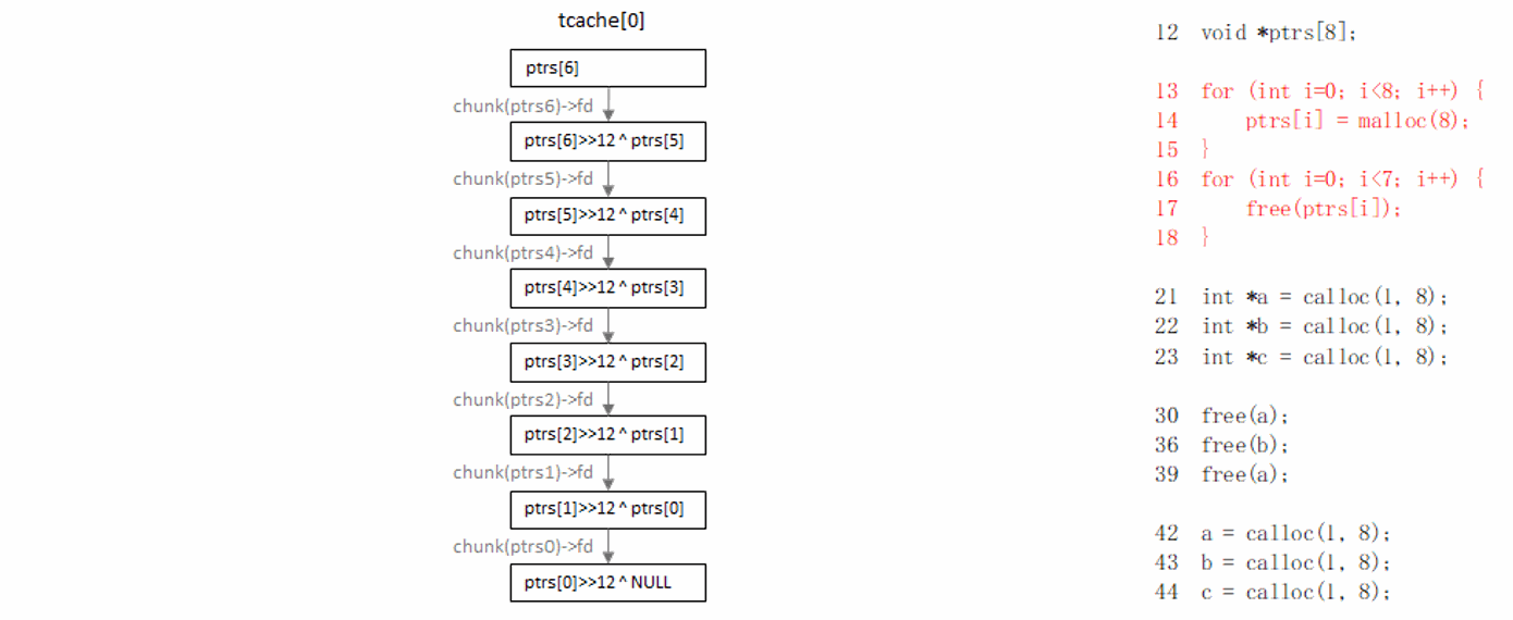 glibc-2.32开始,tcache以及fastbin链表中,chunk->fd不再直接指向下一个节点的地址,而是chunk->fd>>12 ^ 下个节点地址,而如果node和nextnode在同一个4K page,仅通过加密指针本身,就可以还原出nextnode地址。