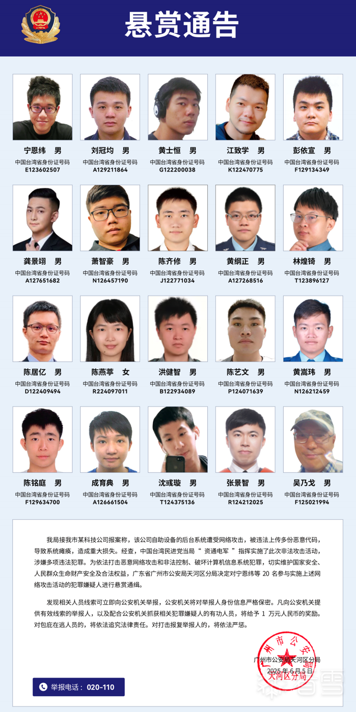 目前,广州警方已对 20 名参与实施本次网络攻击活动的犯罪悬疑人进行悬赏通缉。