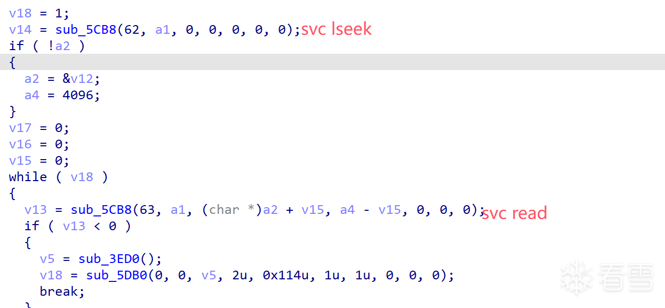 使用的是自实现的svc函数mmap。这个壳没有使用任何libc函数,所有的字符串操作:strcpy,strcmp,内存操作:memcmp等,都是自己实现,或者直接走svc 0。