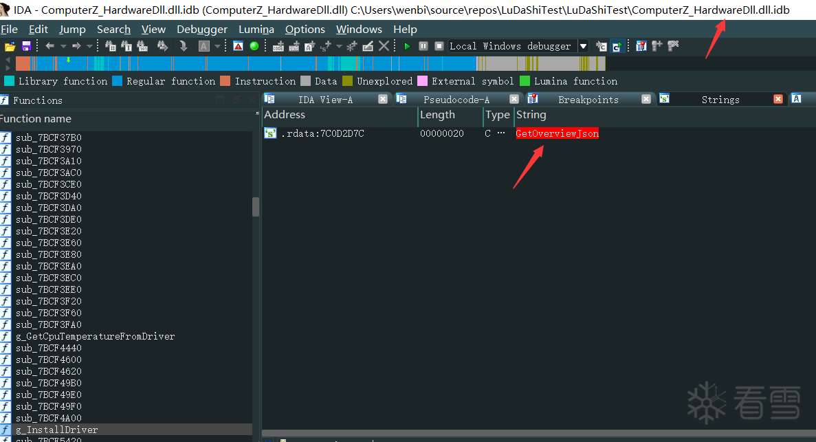 基于前面的日志文件,上IDA打开ComputerZ_HardwareDll.dll,搜索GetOverviewJson字符串: