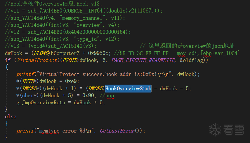 于是写代码依次调用这3个函数,并在g_GetOverviewJson中Hook一下,就能拿到"硬件总览信息”了: