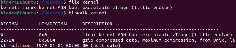 以及上面的 47F7 是我们手动用 binwalk 解包出来的,有些 OTA 包里面可能没有 boot.img 文件,而是有一个 kernel 文件,binwalk 查看是由内核引导头和压缩的 Linux 文件 vmlinux 组成,这时候直接用 vmlinux-to-elf 来生成内核 ELF 文件,就会用到其解压 zImage 模块功能,经测试是要比一些 extract-vmlinux 脚本支持适配得更广泛。