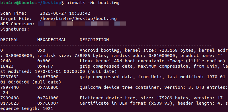 可以通过最简单的抓包方式获取到 OTA 更新包下载地址,不同系统的 OTA 更新包内容各不相同,常见的是会包含一个 boot.img,由内核自解压引导程序、压缩的内核镜像、文件系统、设备树等一起打包,使用 binwalk -Me 命令能查看和提取打包的内容。