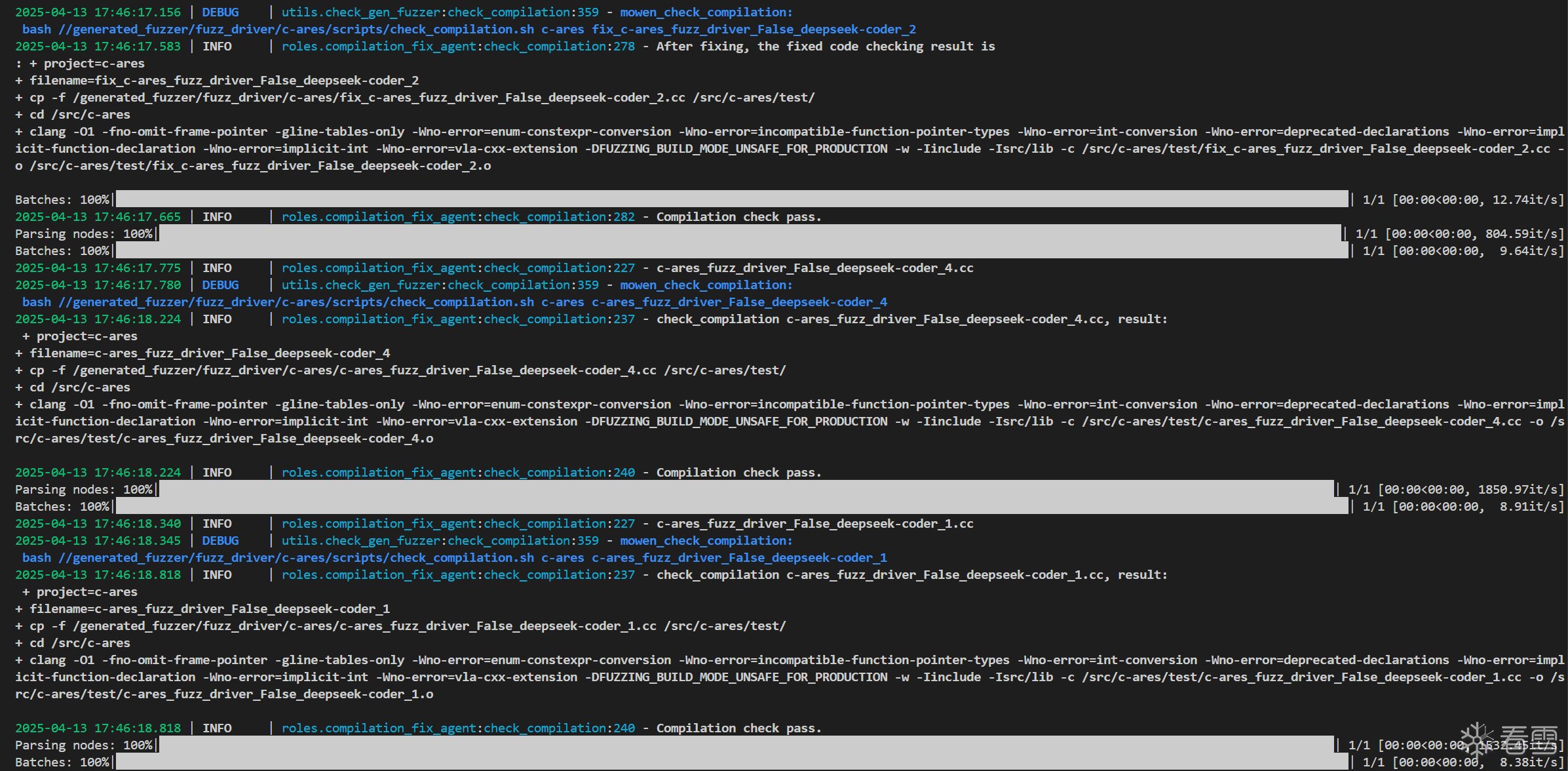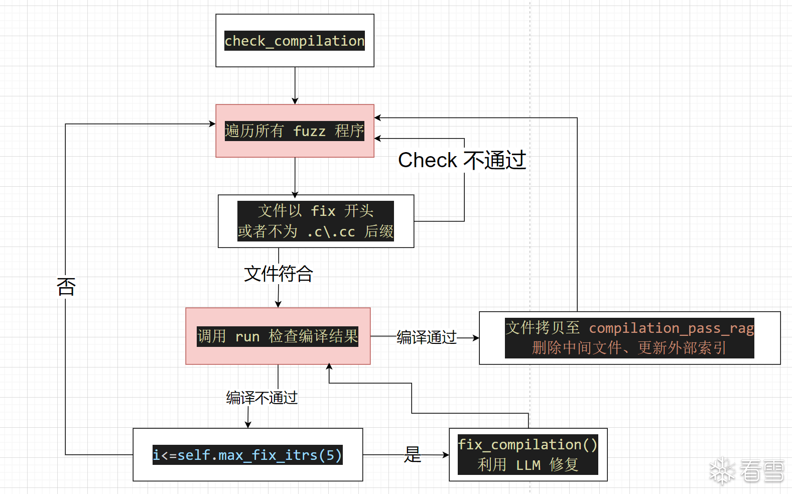 #!/bin/bash set -x project=$1 filename=$2 cp -f /generated_fuzzer/fuzz_driver/${project}/${filename}.cc /src/${project}/test/ cd /src/${project} # [ -d /generated_fuzzer/syntax_check_tmp ] || mkdir -p /generated_fuzzer/syntax_check_tmp #clang -fsyntax-only -w -Wnote -Wextra -pedantic -Iinclude -Isrc/lib /src/${project}/test/${filename} $CC $CFLAGS -w -Iinclude -Isrc/lib -c /src/${project}/test/${filename}.cc -o /src/${project}/test/${filename}.o「4」 如果编译不通过,则调用 fix_compilation() 来使用 LLM 自动修复,修复后还会判断是否编译失败,默认编译失败上限为 5 次。超过 5 次就会抛弃该测试样例。