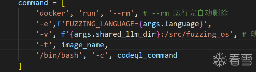def _add_local_repo_to_database(self, args: Dict) -> None: # 获取用户名 USER_NAME = getpass.getuser() # 获取项目目录 project_dir = os.path.join(os.path.dirname(os.path.dirname(os.path.abspath(__file__))), 'projects', args.project_name) # 目录指向 fuzzing_llm_engine/projects/* /home/mowen/CKGFuzzer_mowen/fuzzing_llm_engine/projects/c-ares logger.error(f"mowen: {project_dir}") dockerfile_path = os.path.join(project_dir, 'Dockerfile') # 目录下面包括 build.sh dockerfile project.yaml if not os.path.exists(dockerfile_path): raise FileNotFoundError(f"Dockerfile not found at {dockerfile_path}") # image_name == c-ares_base_image image_name = f'{args.project_name}_base_image' build_command = f'docker build -t {image_name} -f {dockerfile_path} {project_dir}' # 准备docker启动命令 -t 指定构建docker的tag -f 指定dockerfile的目录 最后跟上项目dir # 构建docker镜像 try: subprocess.run(build_command, shell=True, check=True) except subprocess.CalledProcessError as e: print(f"Failed to build Docker image: {e}") return # Prepare the CodeQL command # 创建 codql 数据库 codeql_command = f'/src/fuzzing_os/codeql/codeql database create /src/fuzzing_os/codeqldb/{args.project_name} --language={args.language}' if args.language in ['c', 'cpp', 'c++', 'java', 'csharp', 'go', 'java-kotlin']: codeql_command += f' --command="/src/fuzzing_os/wrapper.sh {args.project_name}"' # Run the Docker container with the CodeQL command command = [ 'docker', 'run', '--rm', '-v', f'{args.shared_llm_dir}:/src/fuzzing_os', # 映射卷,把本地的 shared_llm_dir 挂载到容器中的 /src/fuzzing_os '-t', image_name, '/bin/bash', '-c', codeql_command ] # 在 docker中执行 codeql 指令 result = subprocess.run(command, capture_output=True, text=True) # 更改文件夹所有者,因为docker中是root用户,映射出来有问题 change_folder_owner(f"{args.shared_llm_dir}/change_owner.sh", f'{args.shared_llm_dir}/codeqldb/{args.project_name}', USER_NAME) if f"Successfully created database at /src/fuzzing_os/codeqldb/{args.project_name}" in result.stdout: with open(f'{args.shared_llm_dir}/codeqldb/{args.project_name}/.successfully_created', 'w') as f: f.write('') logger.info(result.stdout) logger.info(f"Confirmed Successfully created database at /src/fuzzing_os/codeqldb/{args.project_name}") else: print(result.stdout) print(result.stderr) assert False, f"Failed to create database at /src/fuzzing_os/codeqldb/{args.project_name}"「1」 使用 getpass.getuse() 获取当前用户名,用于后面更改docker 中的文件所有者,因为文件映射中docker权限为root。