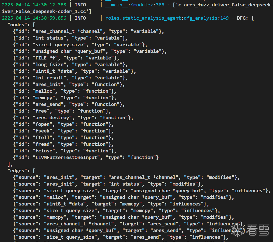 「1」 调用 dfg_analysis() 通过 LLM 对源代码分析得到 DFG,挖掘出代码的数据依赖结构。LLM 后续可以基于 DFG 理解代码结构与变量流向。