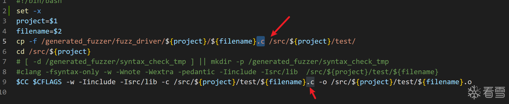 由该脚本又引发一个问题,脚本中固定文件后缀为 .c 拷贝到 /src/{project}/test/ 下然后在进行编译检查
