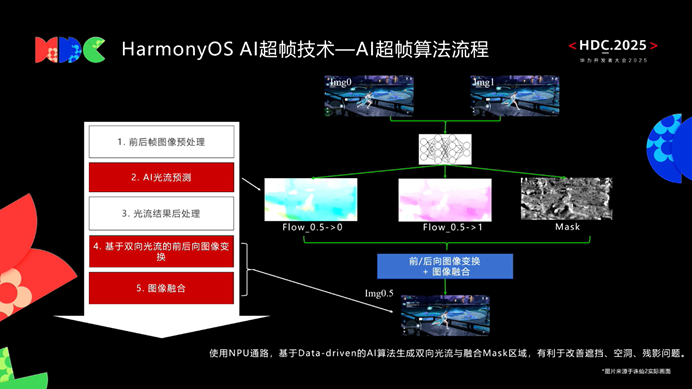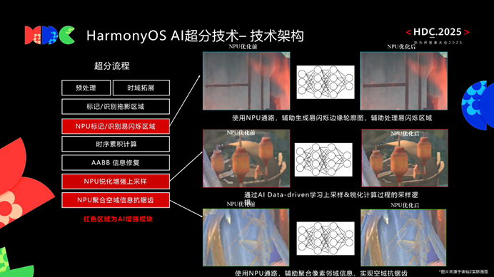 在超分的技术流程中,AI发挥了重要的作用,NPU算力的加入,可以将部分高性能图形处理任务如超分锐化、抗锯齿等大数据量计算从GPU转移到NPU,大大降低了GPU负载: