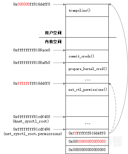 (1) 触发漏洞,修改net_sysctl_root.permissions,使它指向用户空间,使得exp程序,可以进一步控制它的执行内容: