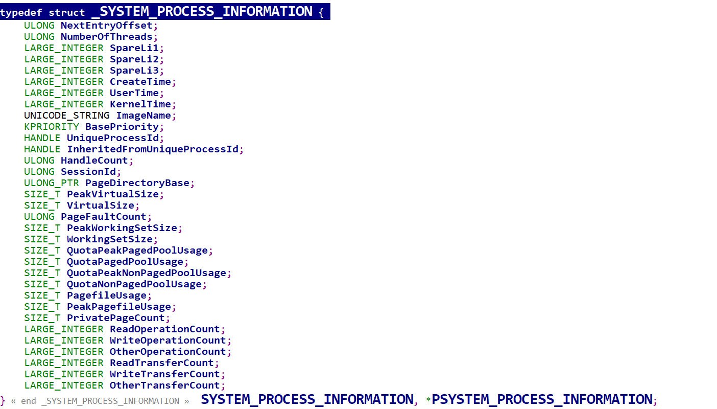 SYSTEM_PROCESS_INFORMATION 算是半公开的结构体,直接查微软文档他会有一些保留字段显示Reserved,可以使用SourceInsight查看WRK1.2的源码观察他。
