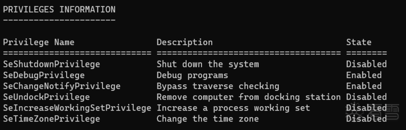 1 2 3 4 5 6 7 8 9 10 11 12 13 14 15 16 17 18 19 20 21 22 23 24 25 26 27 28 29 30 31 32 33 34 35 36 37 38 39 40 41 42 43 44 45 46 47 48 49 50 51 52 | typedef enum _PRIVS{ unk = 0x0, unk2 = 0x1, SeCreateTokenPrivilege = 0x2, SeAssignPrimaryTokenPrivilege = 0x3, SeLockMemoryPrivilege = 0x4, SeIncreaseQuotaPrivilege = 0x5, SeUnsolicitedInputPrivilege = 0x6, SeTcbPrivilege = 0x7, SeSecurityPrivilege = 0x8, SeTakeOwnershipPrivilege = 0x9, SeLoadDriverPrivilege = 0xa, SeSystemProfilePrivilege = 0xb, SeSystemtimePrivilege = 0xc, SeProfileSingleProcessPrivilege = 0xd, SeIncreaseBasePriorityPrivilege = 0xe, SeCreatePagefilePrivilege = 0xf, SeCreatePermanentPrivilege = 0x10, SeBackupPrivilege = 0x11, SeRestorePrivilege = 0x12, SeShutdownPrivilege = 0x13, SeDebugPrivilege = 0x14, SeAuditPrivilege = 0x15, SeSystemEnvironmentPrivilege = 0x16, SeChangeNotifyPrivilege = 0x17, SeRemoteShutdownPrivilege = 0x18, SeUndockPrivilege = 0x19, SeSyncAgentPrivilege = 0x1a, SeEnableDelegationPrivilege = 0x1b, SeManageVolumePrivilege = 0x1c, SeImpersonatePrivilege = 0x1d, SeCreateGlobalPrivilege = 0x1e, SeTrustedCredManAccessPrivilege = 0x1f, SeRelabelPrivilege = 0x20, SeIncreaseWorkingSetPrivilege = 0x21, SeTimeZonePrivilege = 0x22, SeCreateSymbolicLinkPrivilege = 0x23, SeDelegateSessionUserImpersonatePrivilege = 0x24} PRIV;typedef struct _PrivOffsets { uint16_t amount; uint16_t offset; } PrivOffsets;consteval PrivOffsets CalcPrivIncrement(PRIV priv) { PrivOffsets offset = { 0 }; offset.offset = priv / 8; offset.amount = 1 << ((priv & 0x7)); return offset;} |