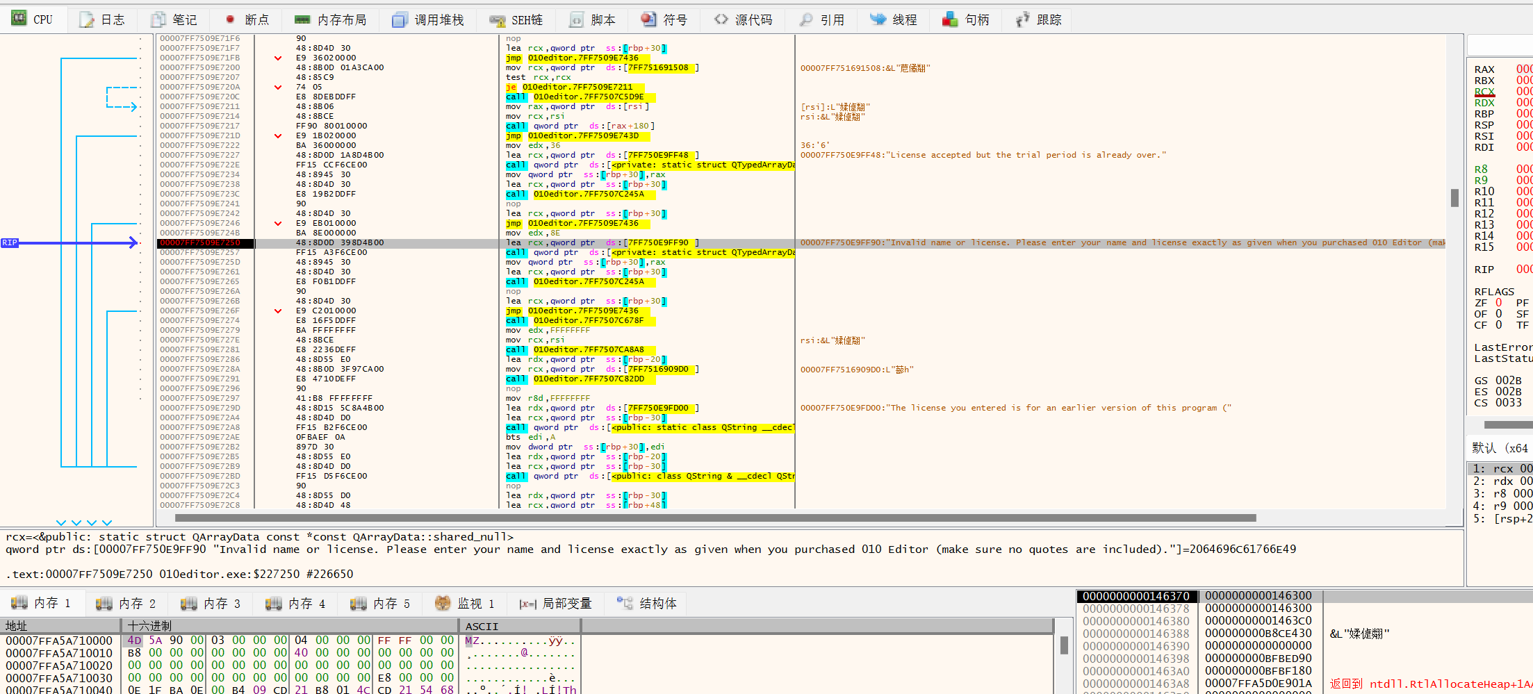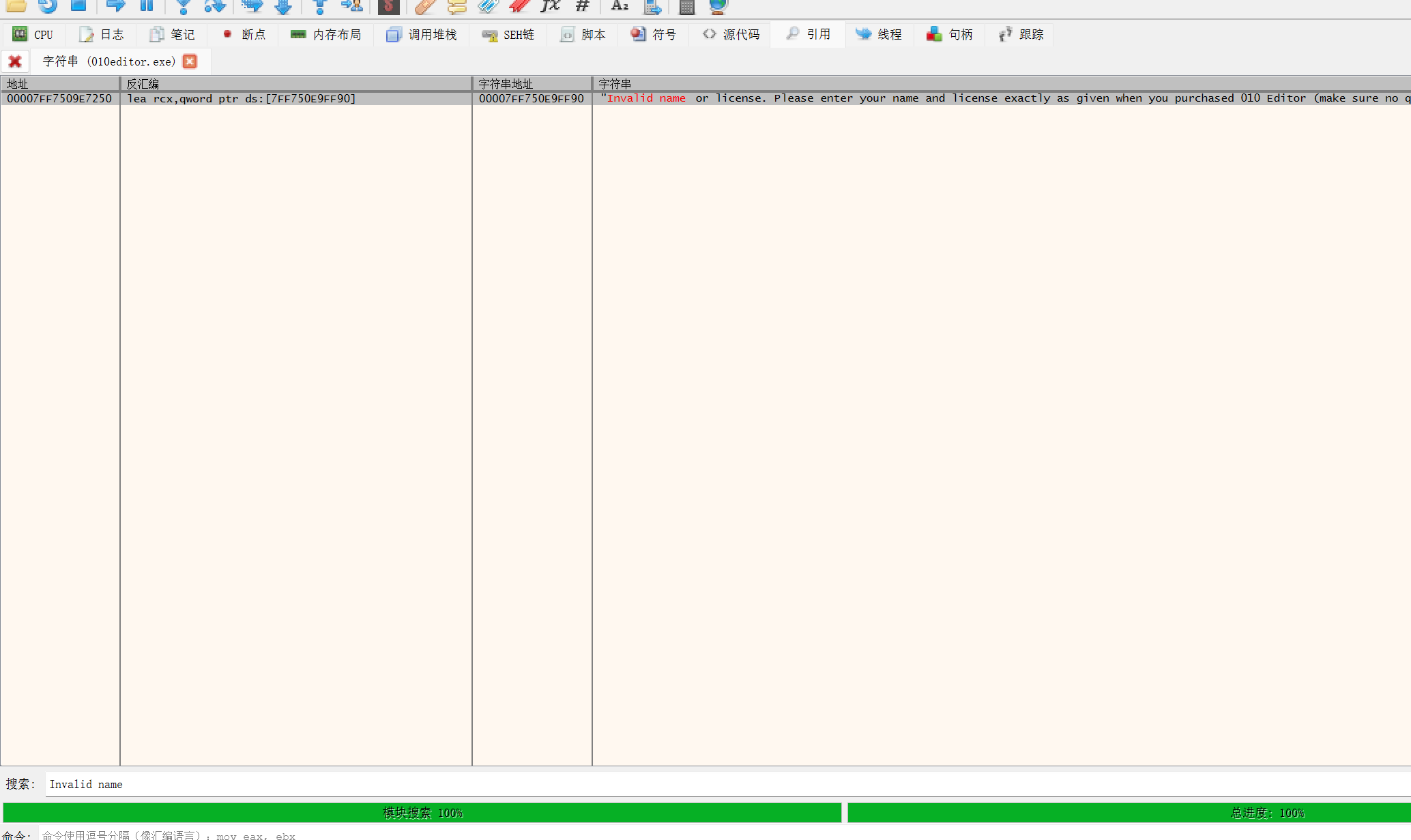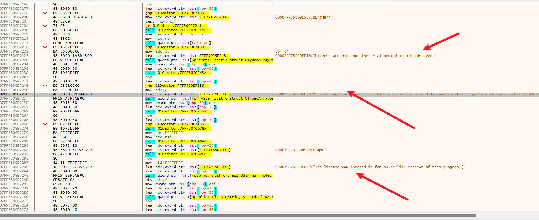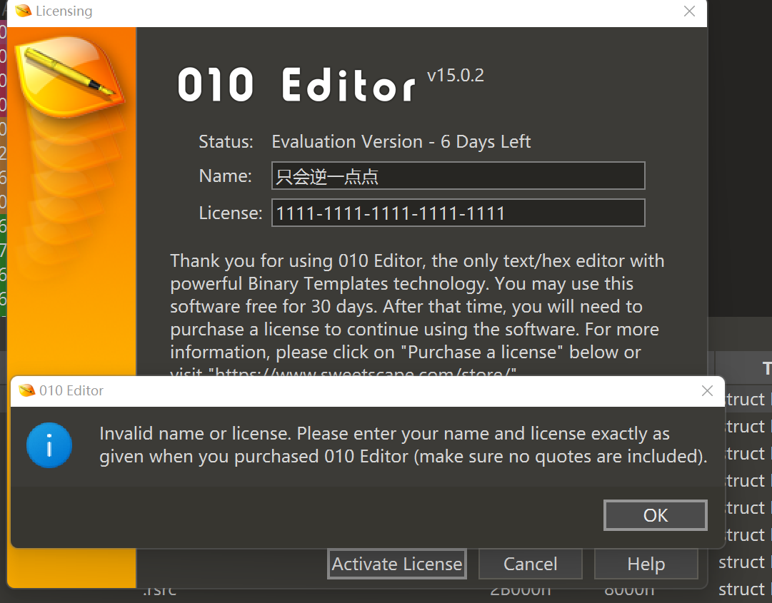 字符串="Invalid name or license. Please enter your name and license exactly as given when you purchased 010 Editor (make sure no quotes are included)."