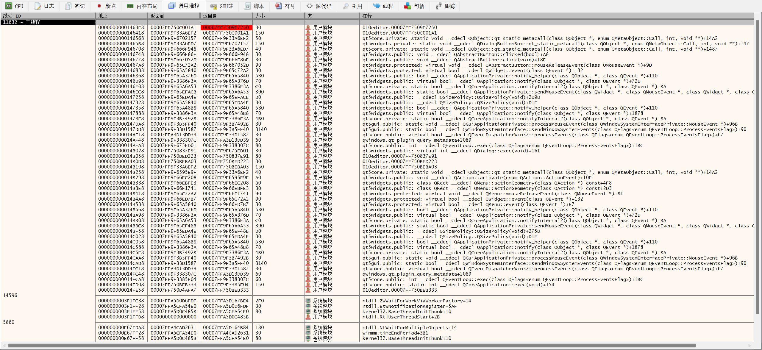 观察后可猜测,关键代码在主线程,且第三行开始是qt库的相关信息。所以我们从第二行开始执行。