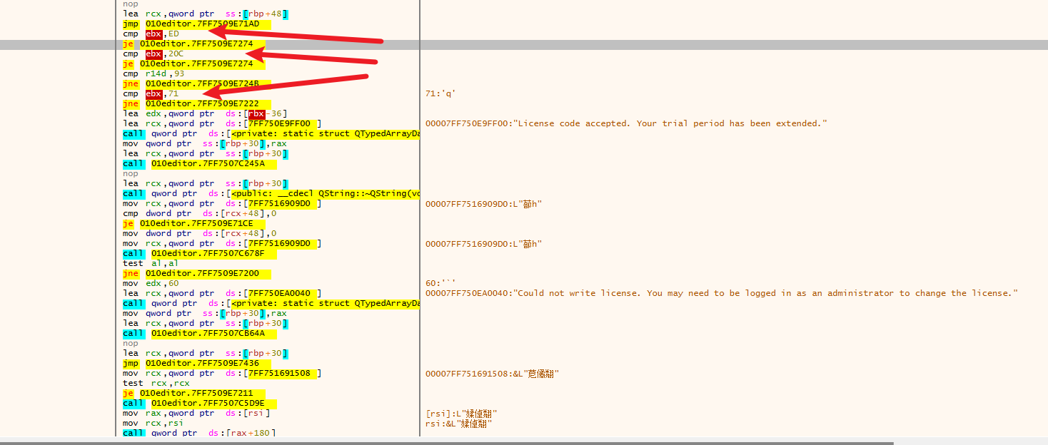 这里可以看到ebx没有被重新赋值,且一直在比较,并跳转对应分支,下面的就没必要看了都是各种理由的失败,而成功的提示就一个。果然通往成功的路上是孤独的。