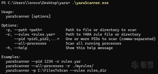 -p, --path Path to file or directory to scan -r, --rules <rules.yar> Path to YARA rule file or directory --pid <pid1,pid2,...> One or more PIDs to scan (comma-separated) --all-processes Scan all running processes -h, --help Show this help message