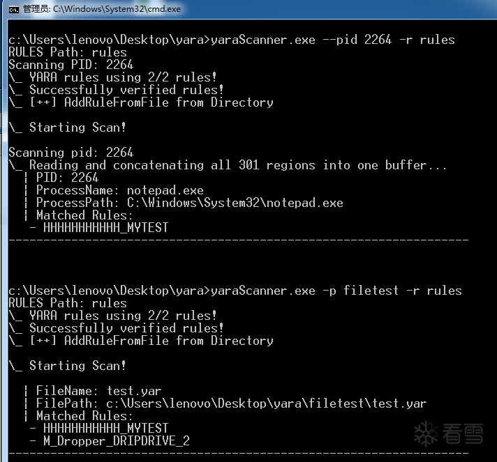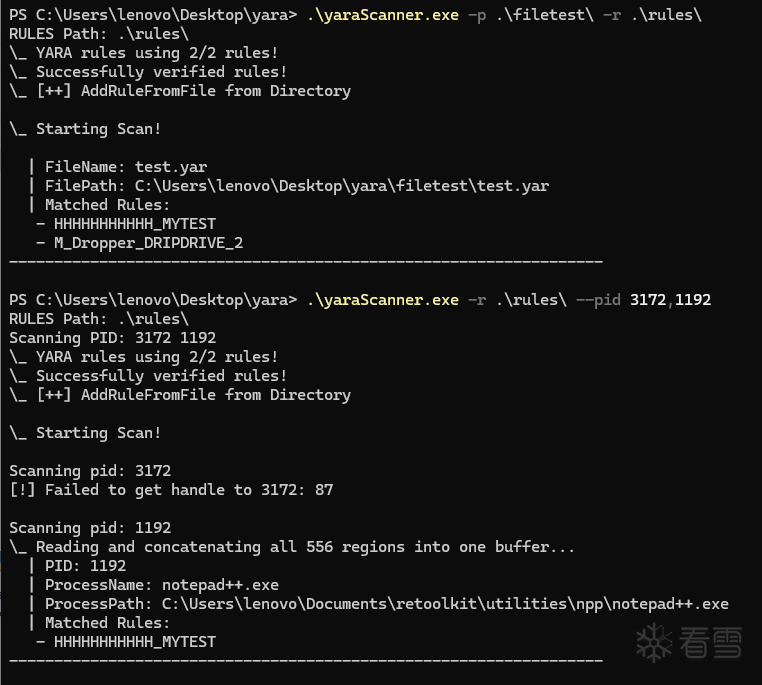 目前只支持 Windows,建议管理员权限运行。基于 YARA 库的,编译之后无法将 libcrypto-3-x64.dll 打包进程序,因此用 Enigma Virtual Box 打包了一下。本来考虑内置规则的,但是一般情况下规则都不是固定的,因此没内置。