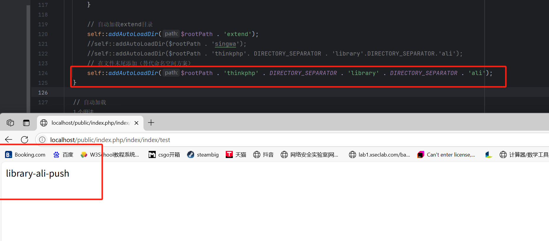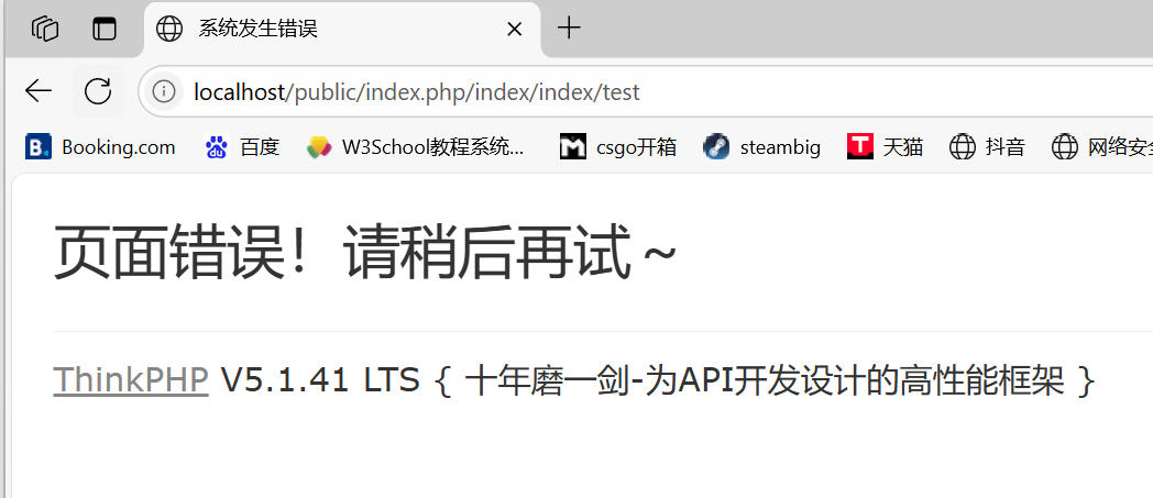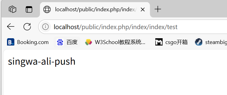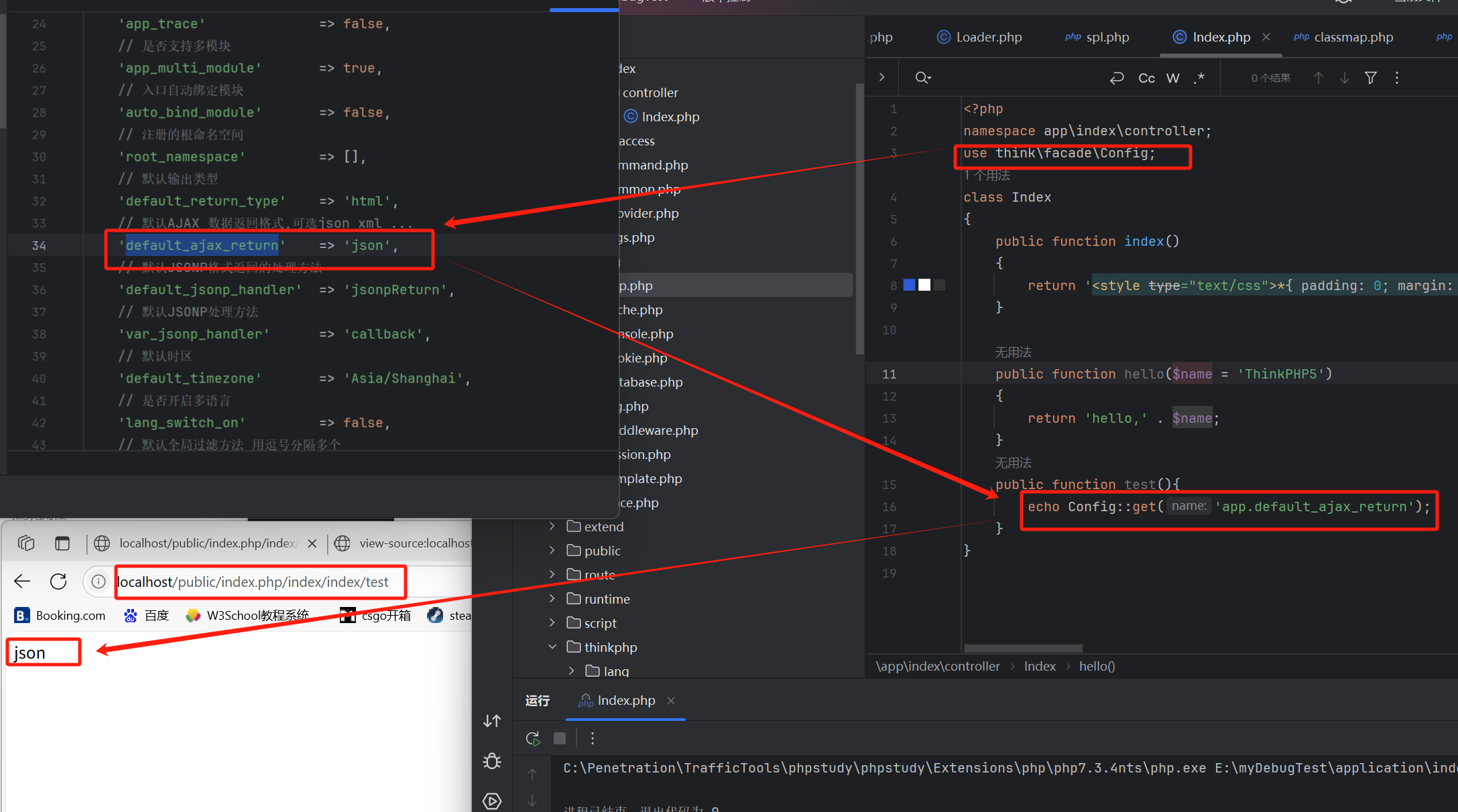 这个了解完之后做个验证,比如说调用Config这个类(因为我这里本地搭建的有问题,所以前面要带具体目录一般情况下直接localhost/index/index/test就好)