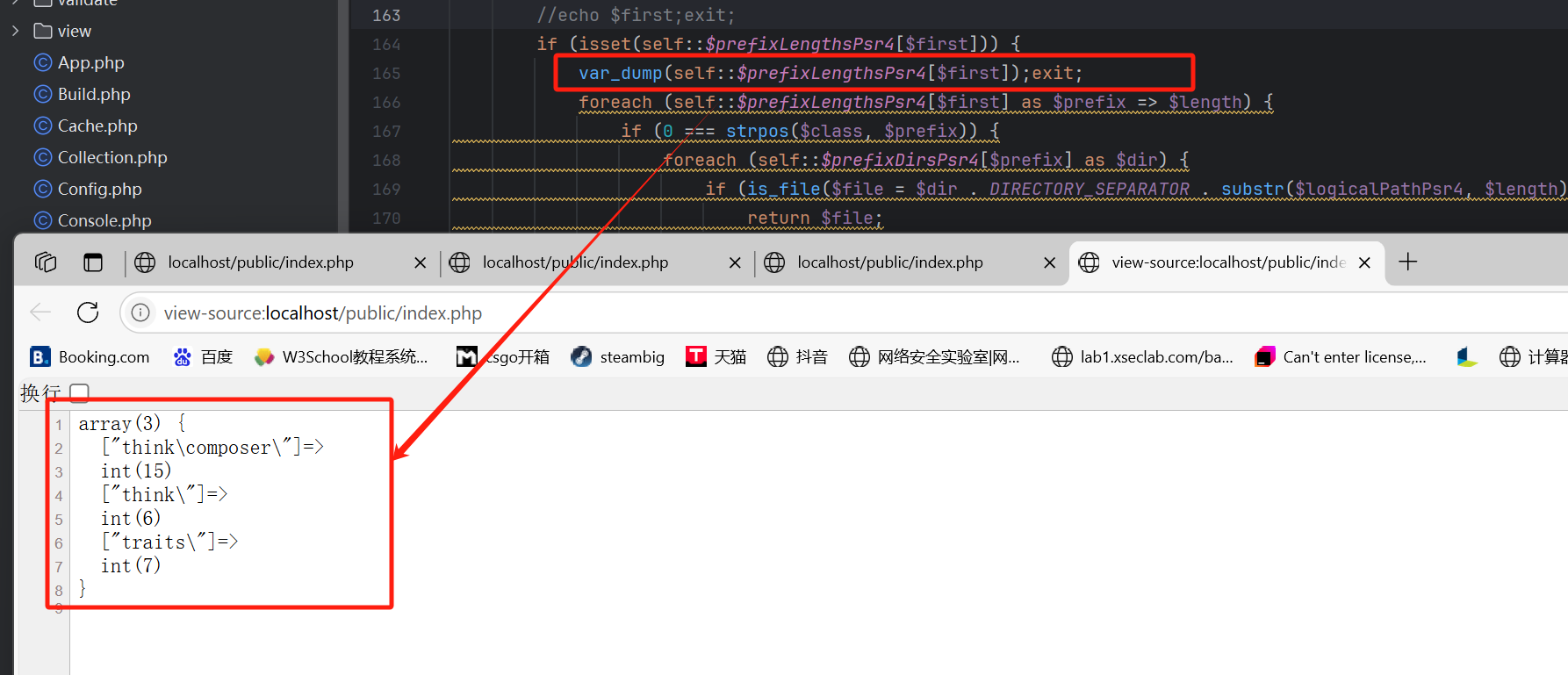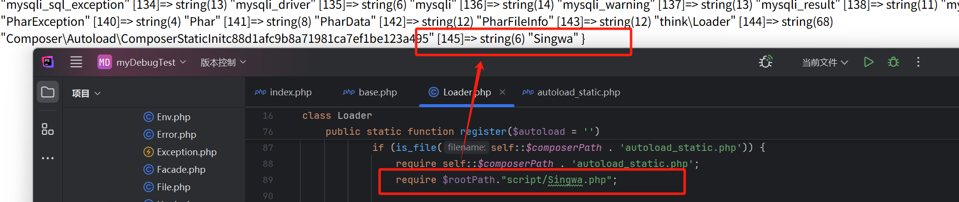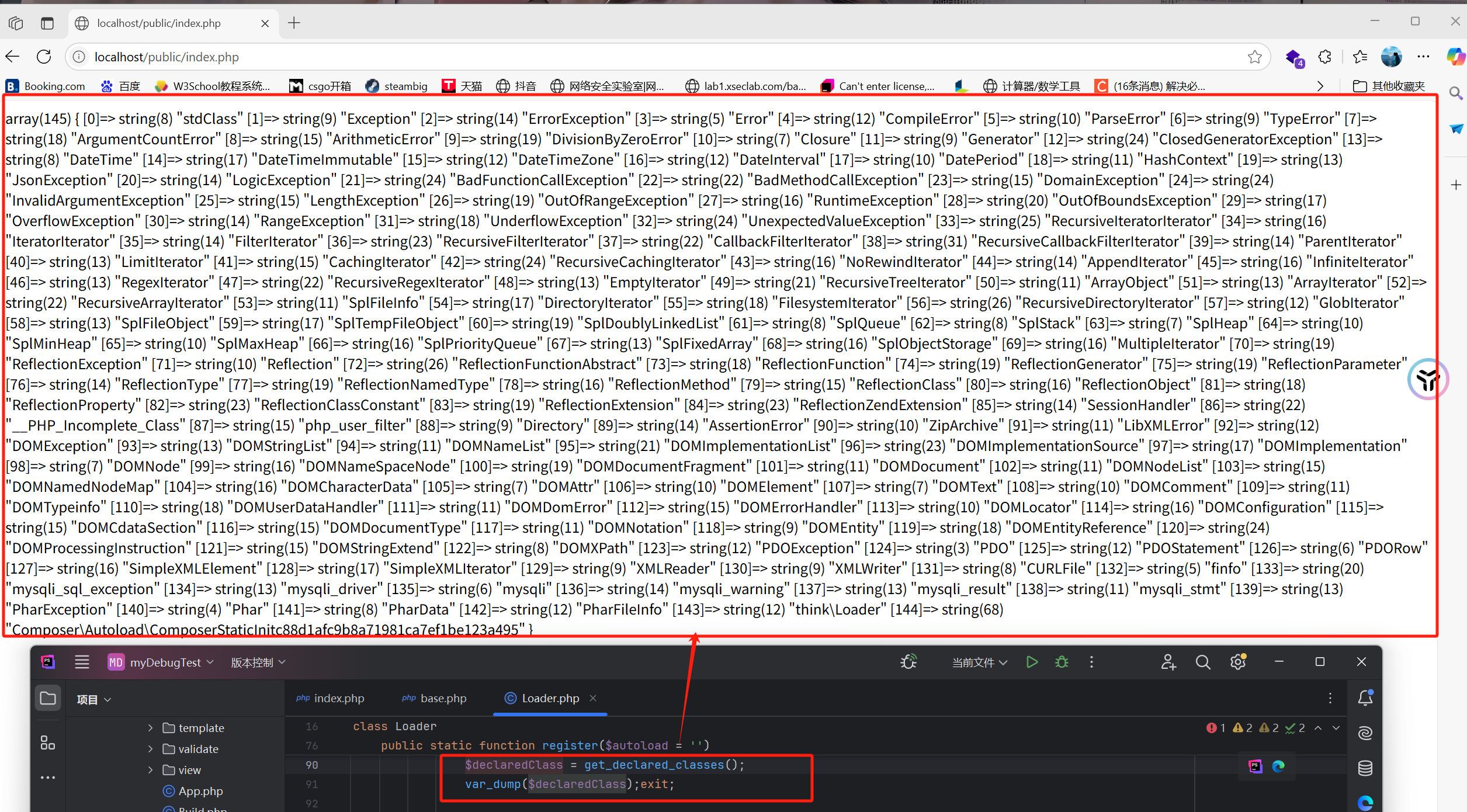 再往下的话会有一个php内置的一个方法get_declared_classes,它的作用是返回由已定义类的名字所组成的数组,可以进行一个简单的打印看一下,这是一个简单的调试过程