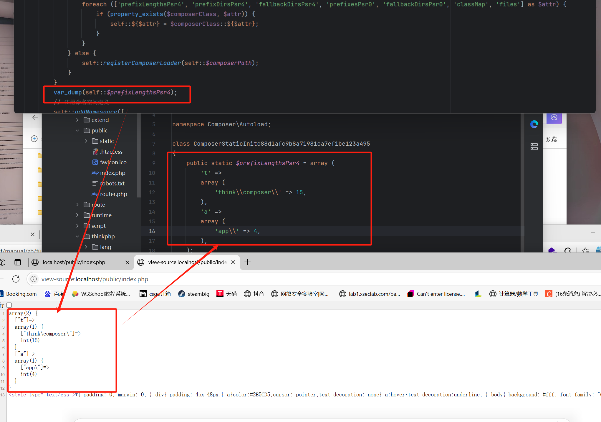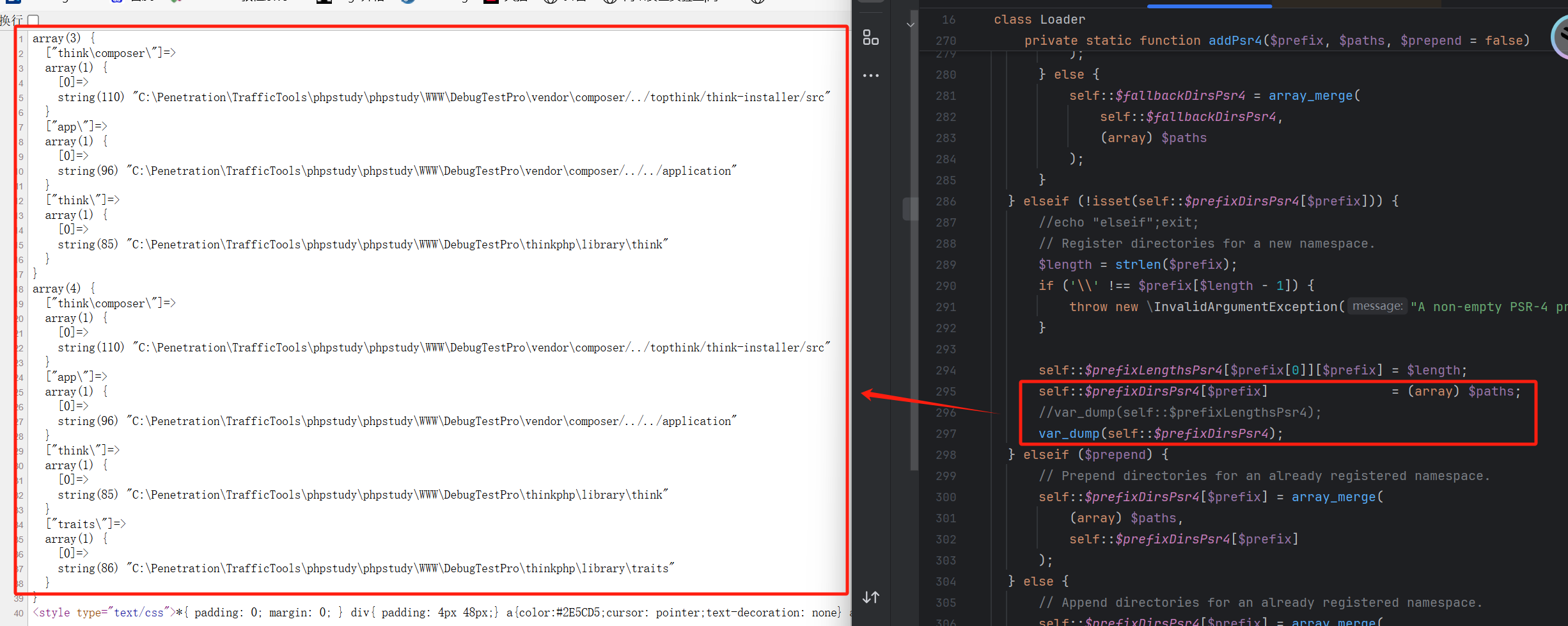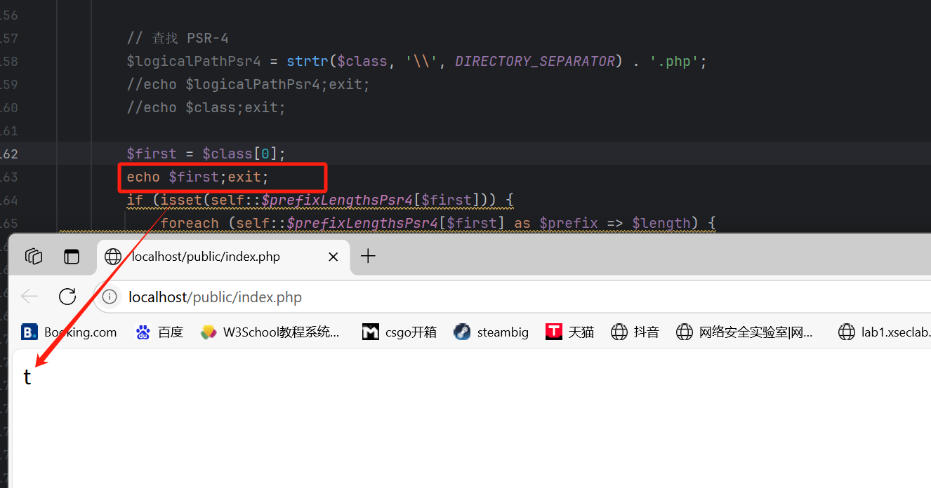 再往下的话会有一个php内置的一个方法get_declared_classes,它的作用是返回由已定义类的名字所组成的数组,可以进行一个简单的打印看一下,这是一个简单的调试过程
