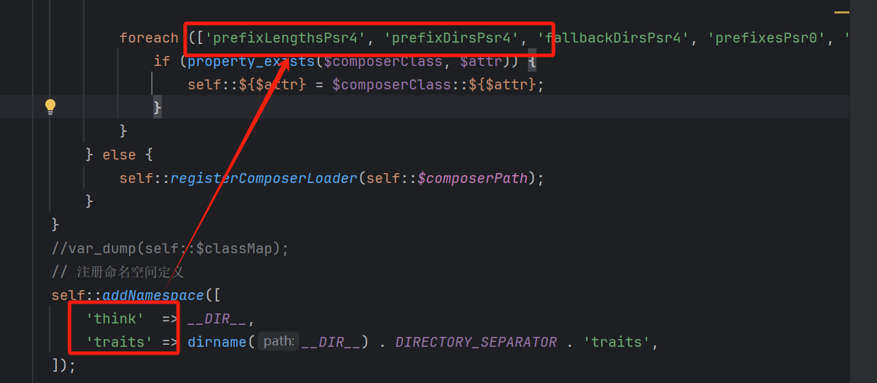 在这个判断里面的$classAlias其实就是base.php里面的addclassAlias方法,然后通过追踪这个方法就可以找到注册类别名具体的调用