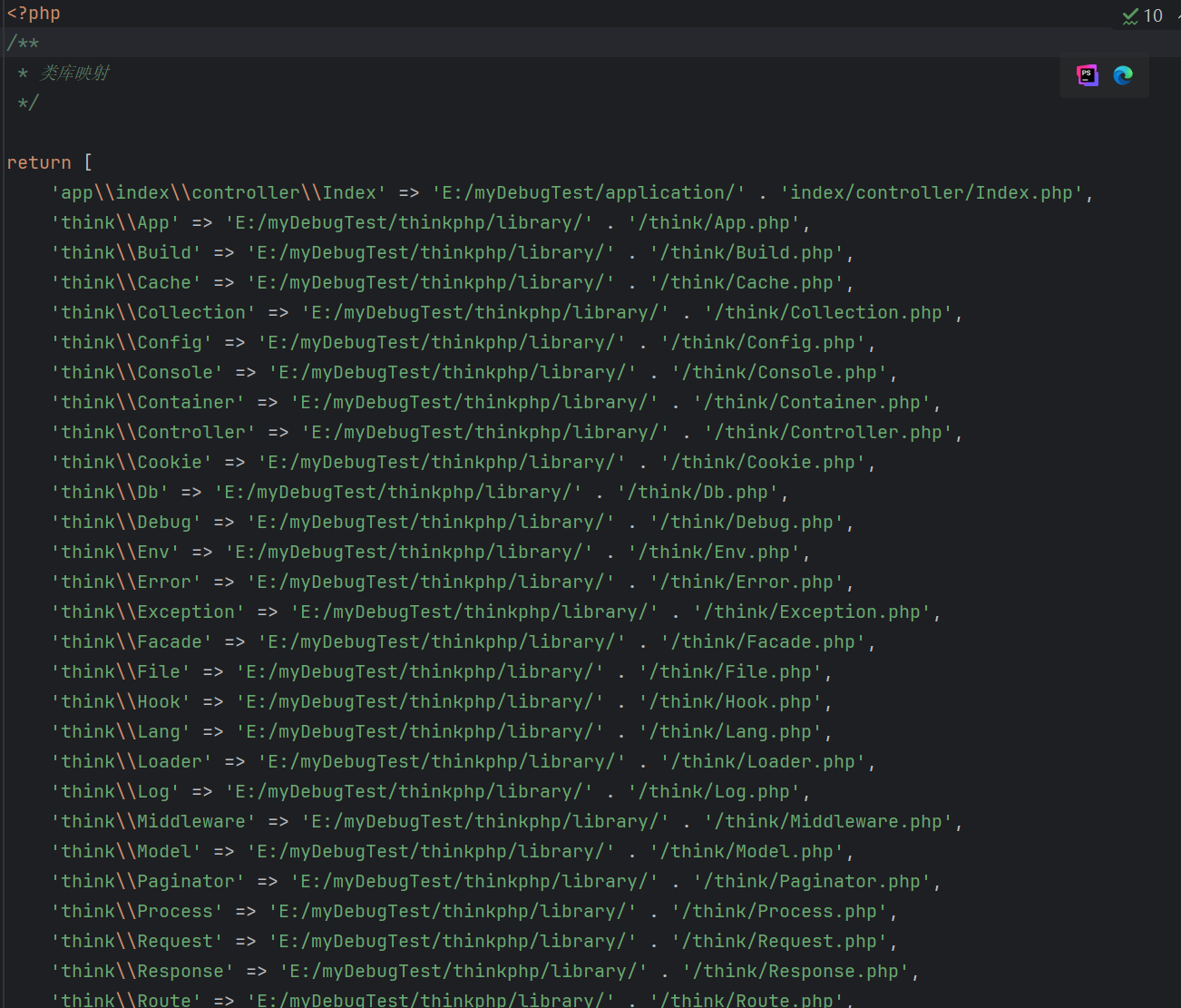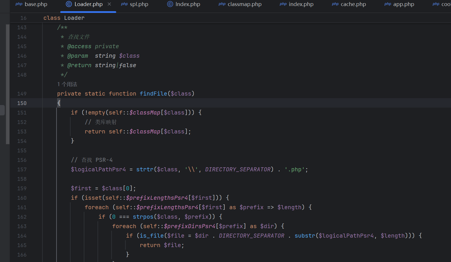 跟进之后可以看到里面的主体,有个classMap方法,这个方法之前讲过详细可以看加载类库映射文件章节,其实就是类对应到哪个目录的映射关系存储,它存储在了runtime目录下的classmap.php里面