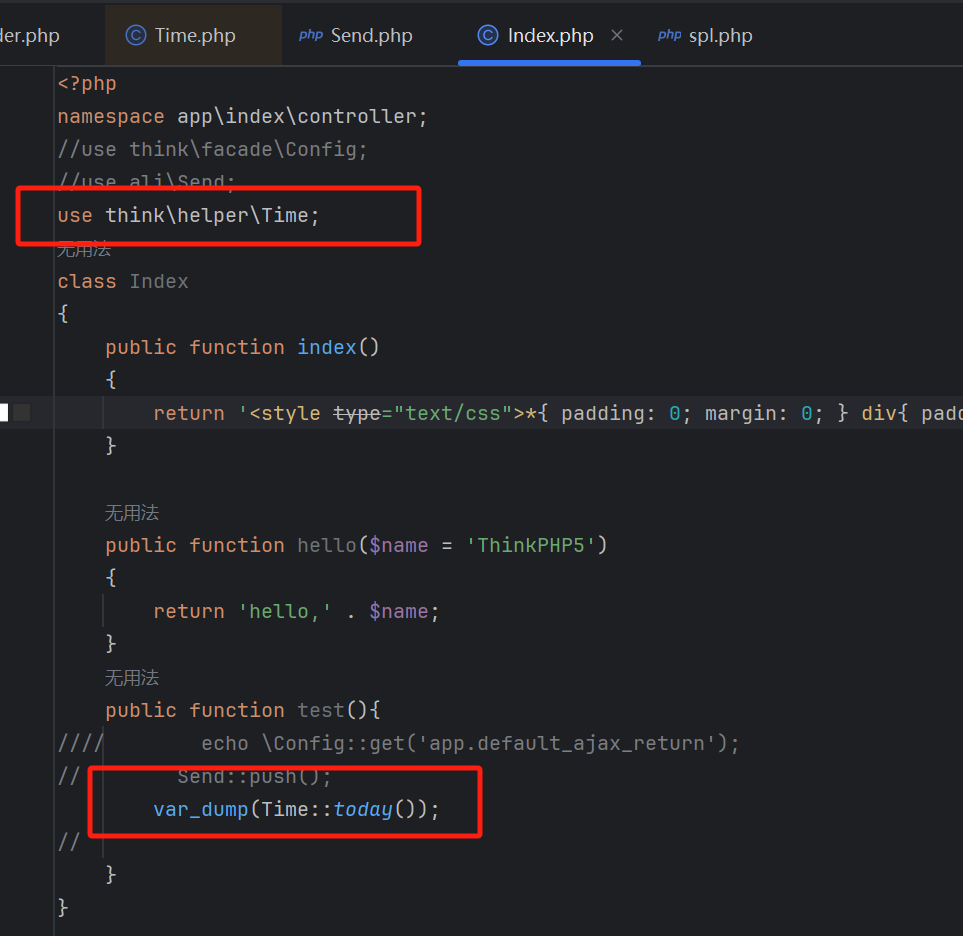然后在application->index->controller->index.php中写入要调用的类,当然要使用的命名空间不能少