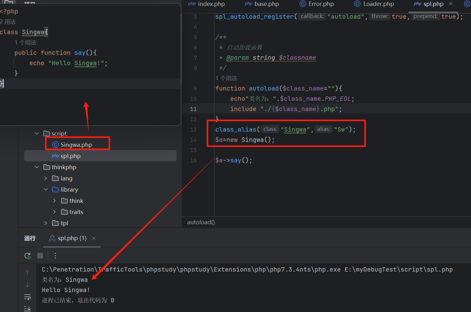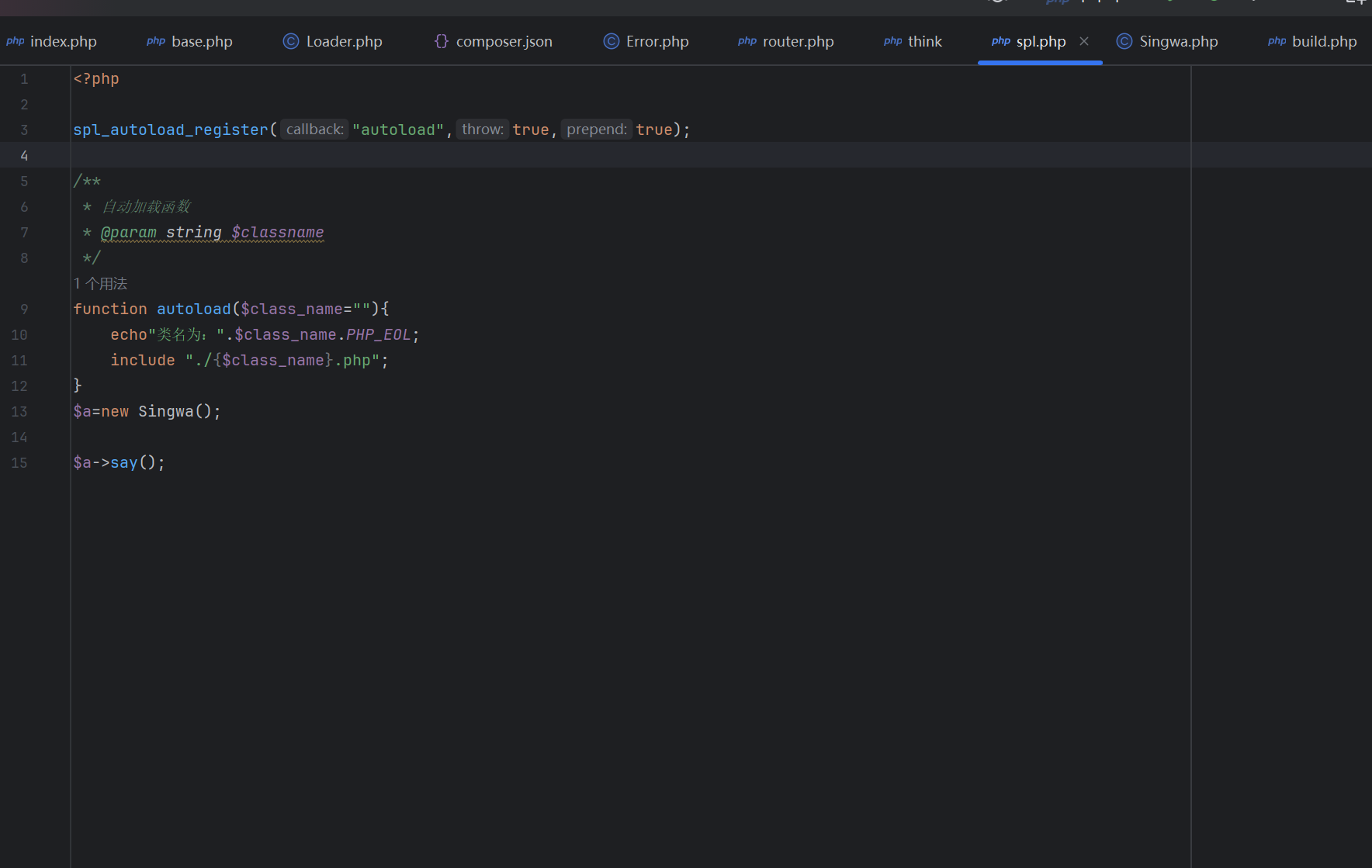 2.触发自动加载:当执行new Singwa()时,Singwa类未定义,PHP会调用注册的autoload函数,传入类名“Singwa”。