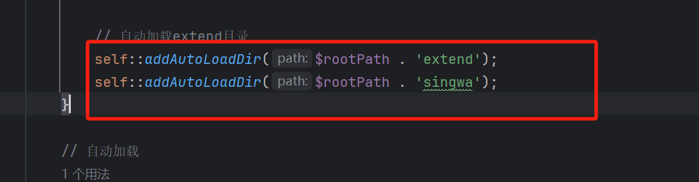 因为在自动加载备选目录的时候只有extend目录,我们只需要模仿写一个singwa的就可以,因为singwa是自定义的