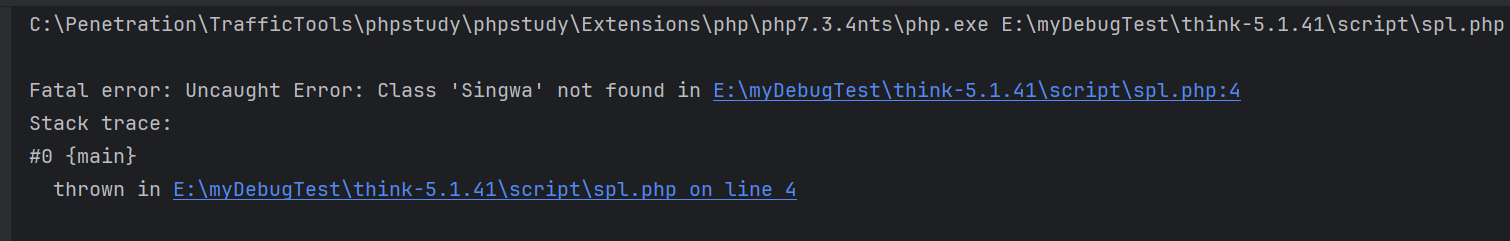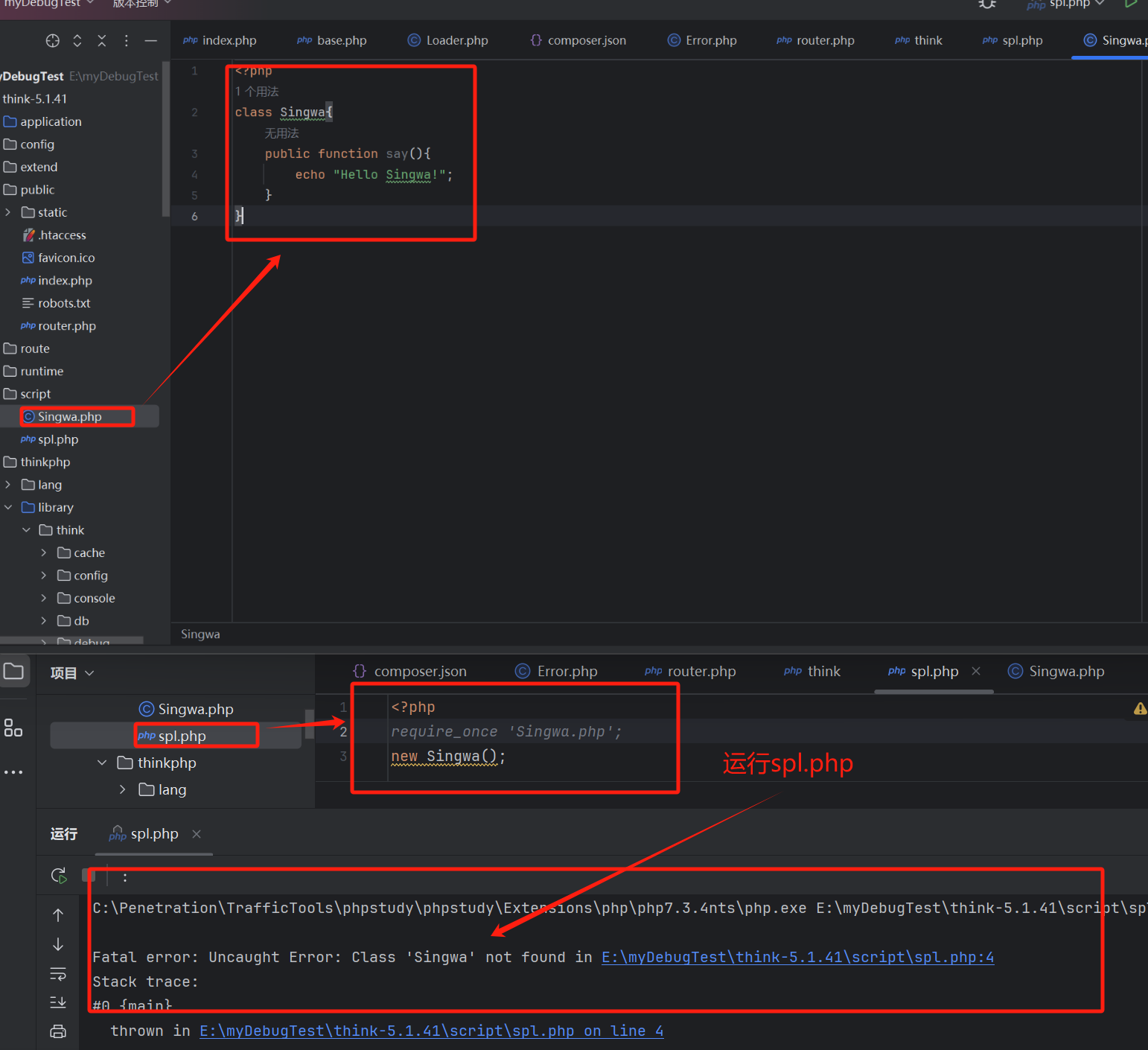 假设在创建一个Singwa.php里面写入创建的类其实也是不存在的因为在spl.php找不到Singwa.php里面类的所以运行还是报错