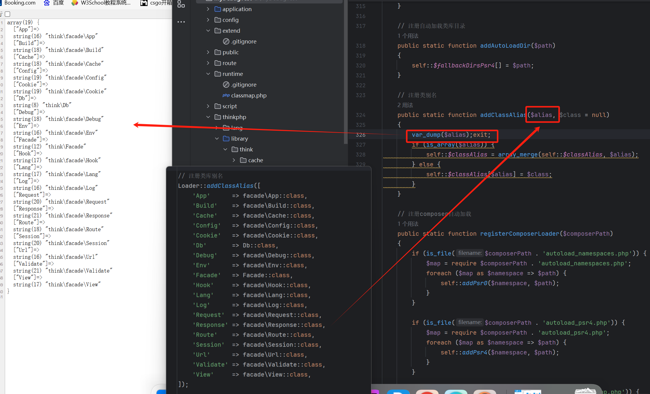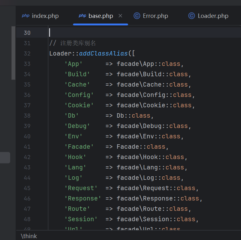 然后通过调试,把$alias里面的数据打印出来看一下,其实就是base.php里面的注册类库别名