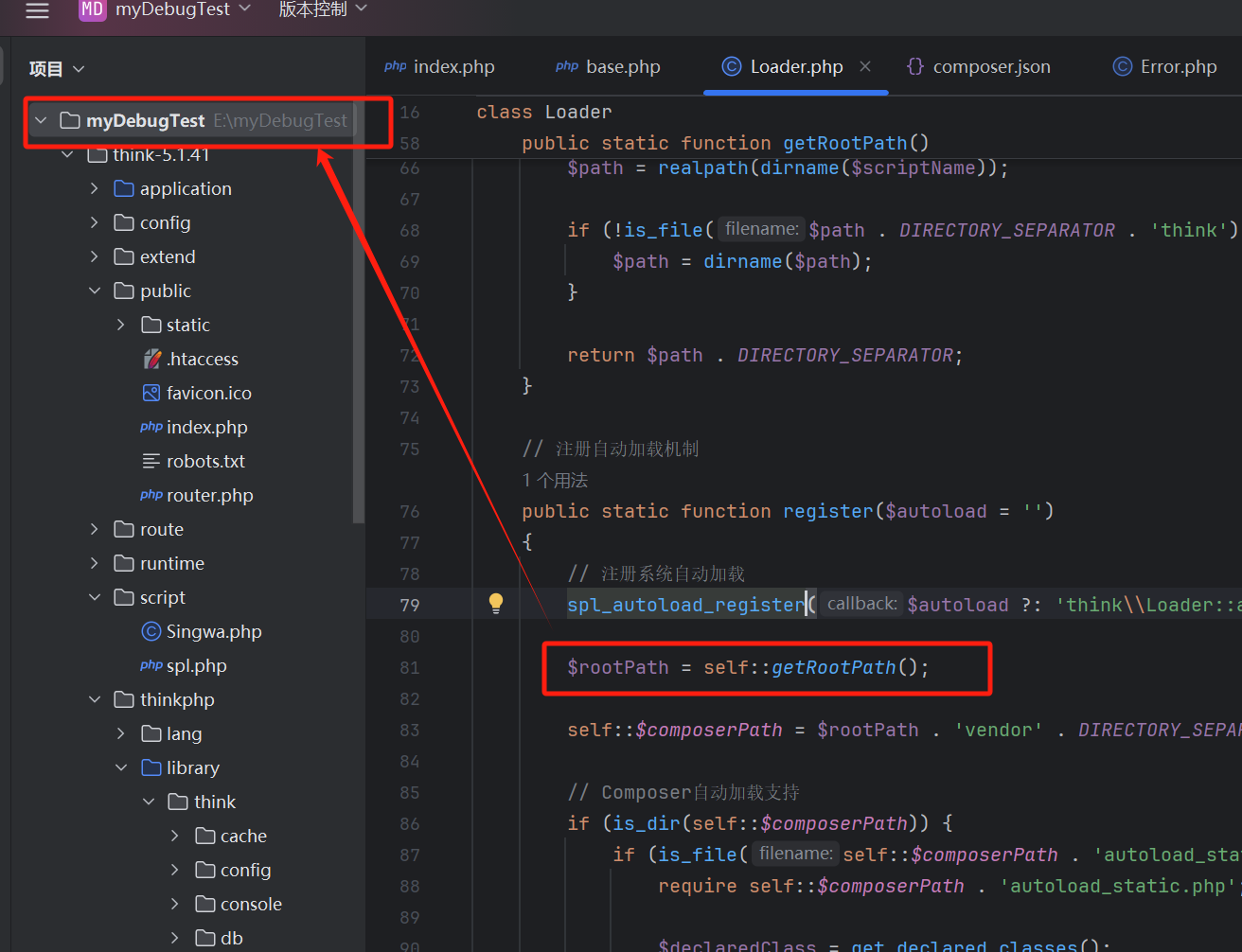 而下面这个方法是获得根目录并赋值给$rootPath,我这里的根目录是myDebugTest