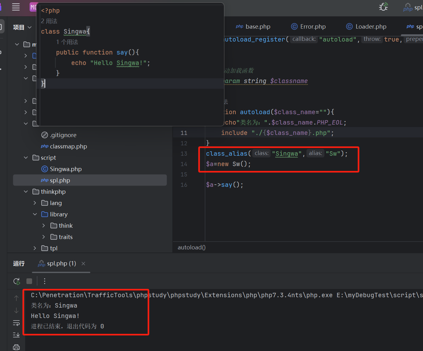 那改成$a=new Sw();看看效果,这个函数其实就是将Singwa别名设置为Sw,当然也可以将Sw改成其他的不做演示了