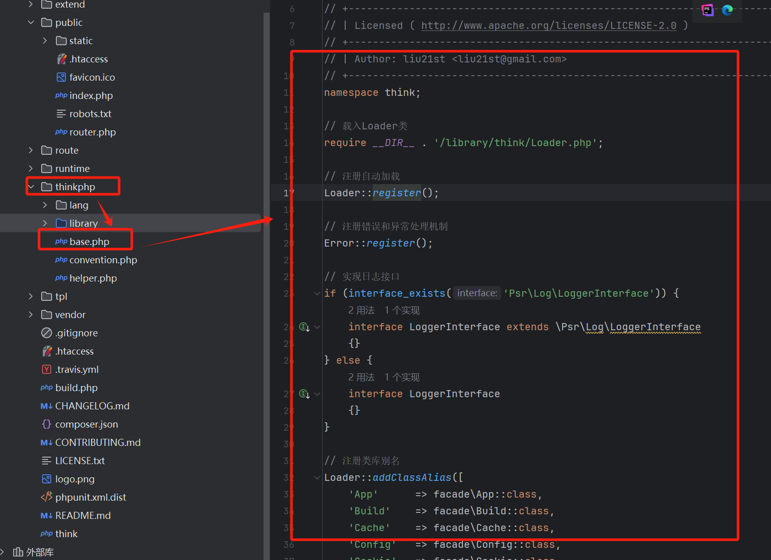 可以看到第二行代码将Loader类载入,注册自动加载机制功能、错误异常机制、日志接口、注册类库别名。